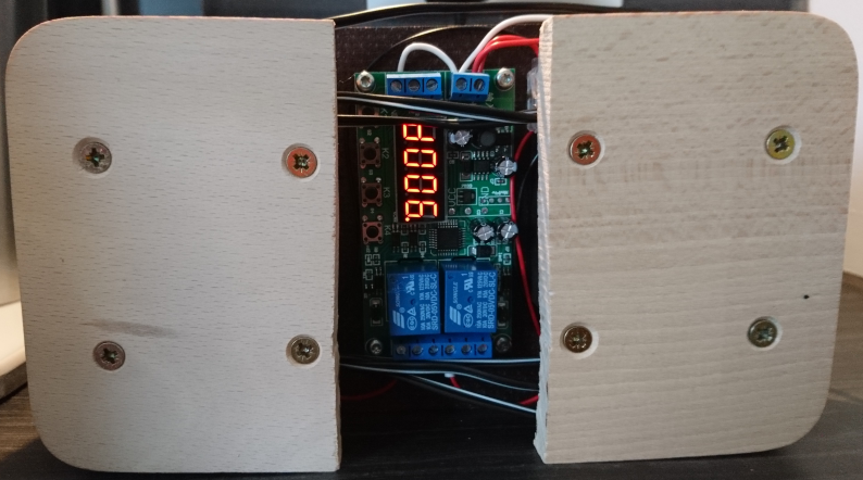 Unterseite mit zugänglichem Zeitrelais für die Einstellung der Schaltintervalle. Eine Außenverkleidung zum Schutz gegen Spritzwasser werde ich noch anbringen.