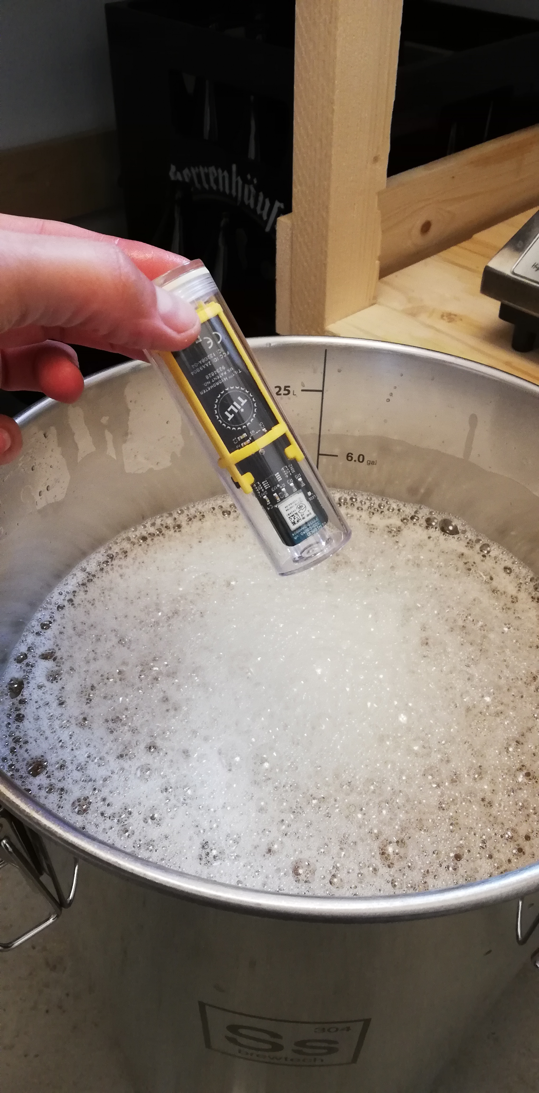 Dann kam noch mein neuer TILT Sensor rein und dann das Ganze in mein Styropor Gärschrank. Heute morgen gärt es bereits wie wild und der TILT sagt, ich bin schon bei 9,5°P. Temperatur im Gärraum ist bei nur noch 15,5 Grad, TILT sagt in Brühe sind es 18,9°C. Früher hab ich immer viel zu warm vergoren, da hatte ich keinen TILT und habe die Temperatur im Gärraum bei 20°C gehabt. Ich denke so ist es besser, vielleicht sogar immer noch ein Ticken zu warm?