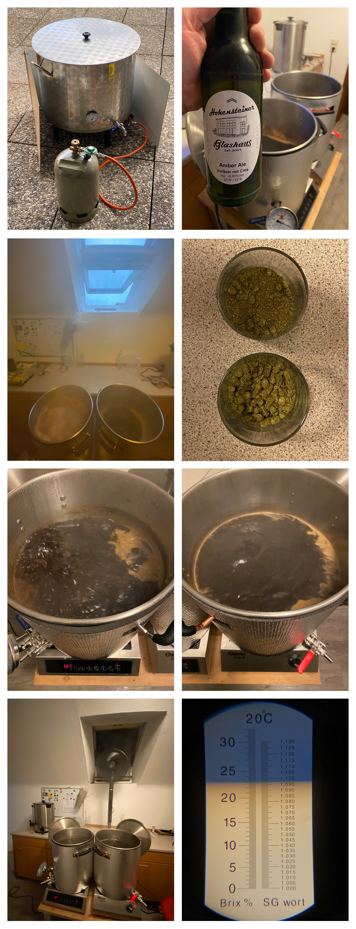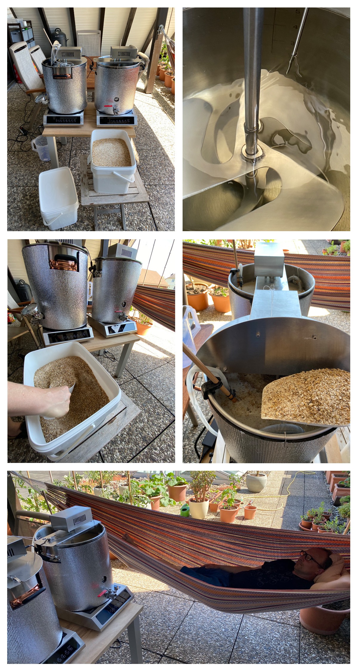 Das Problem war, dass wir für ein 40-Liter Fass mit 43 Litern Ausschlagvolumen kalkuliert haben (bei 60 % SHA, normalerweise schaffen wir etwas mehr). Unsere "Anlage" ist auf 20 - 25 Liter ausgelegt. Also haben wir die Würzepfanne zum Maischkessel umgebaut (zweite Läuterhexe besorgt) und uns einen großen Topf besorgt, um die Würze zu kochen. Der sollte 70 Liter haben, hatte dann aber 150 oder mehr. Die "Zweizylinderanlage" funktionierte aber nicht schlecht. Eine Induktionsplatte mit Temperaturregelung und Rührwerk, die zweite handgesteuert und handgerührt.