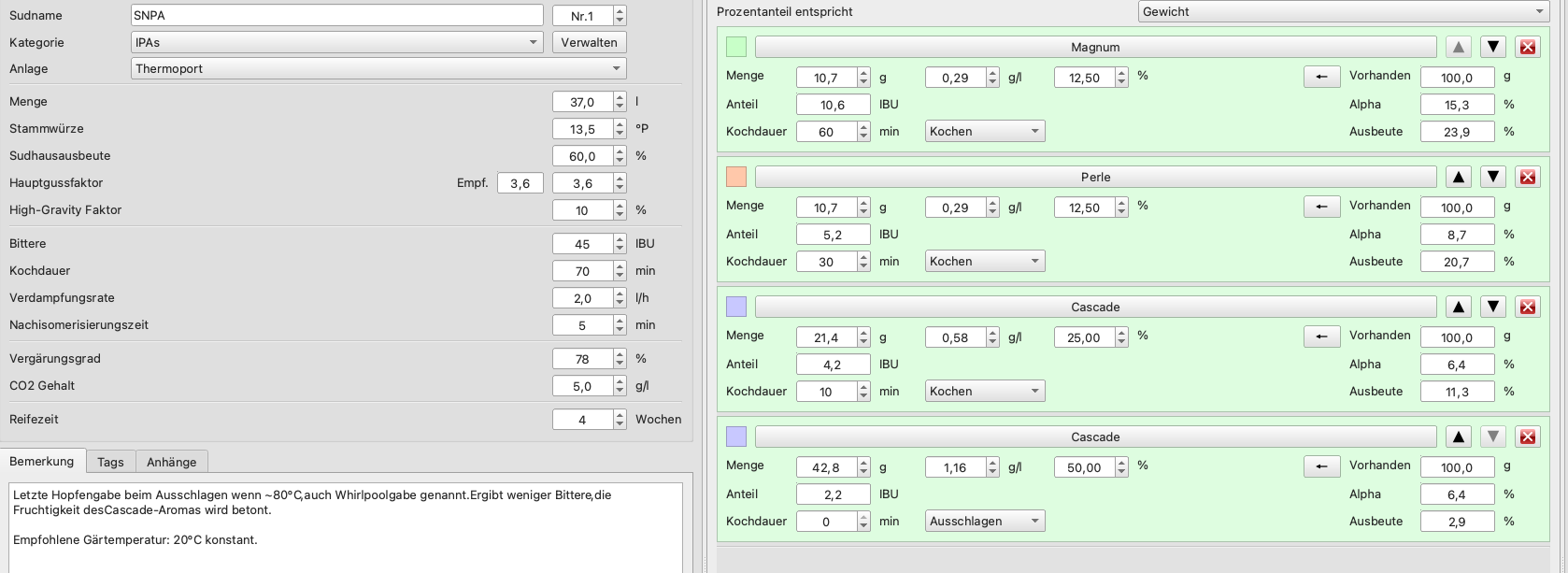 Ersetzt doch nur bedingt eine Übersicht in der Rohstoffliste, wo das Thema logischerweise hingehört, meiner Meinung nach. Ich weiß nicht immer welches Malz ich wo verwende, Klicke ich alle ungebrauten Rezpte, Rechercherezepte etc. an, wird es unübersichtlich. Was hier fehlt, ist eine Zuordnung einer Zutat zu ihren Rezepten. Also: In welchen Rezepten verwende ich Cascade 2019?