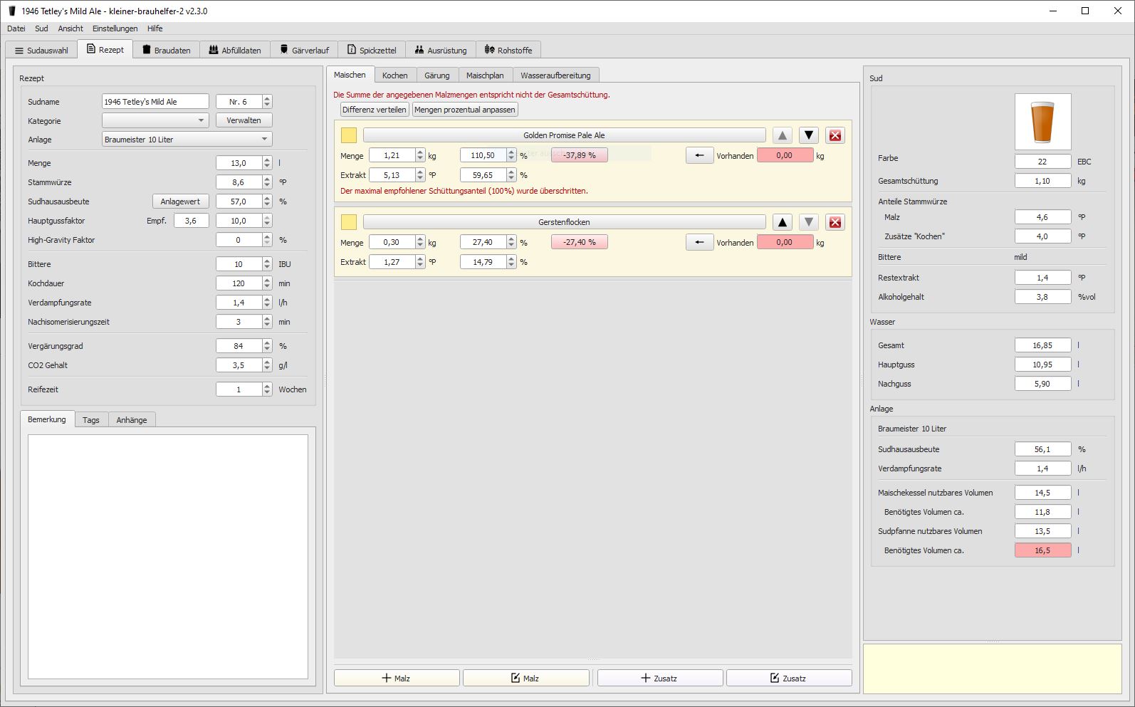 Und die letzte Frage: Früher gab es mal nicht nur den Hinweis, wieviel Wasser man zugeben muss, um auf die angepeilte Stammwürze zu kommen - man konnte auch festhalten, dass man diese Menge Wasser auch zugegeben hat. Wie mache ich das jetzt? Ich bekomme ja falsche Angaben zur Jungbiermenge im Reiter "Abfülldaten", wenn ich im Reiter "Braudaten" die Anstellmenge nicht korrigieren kann.