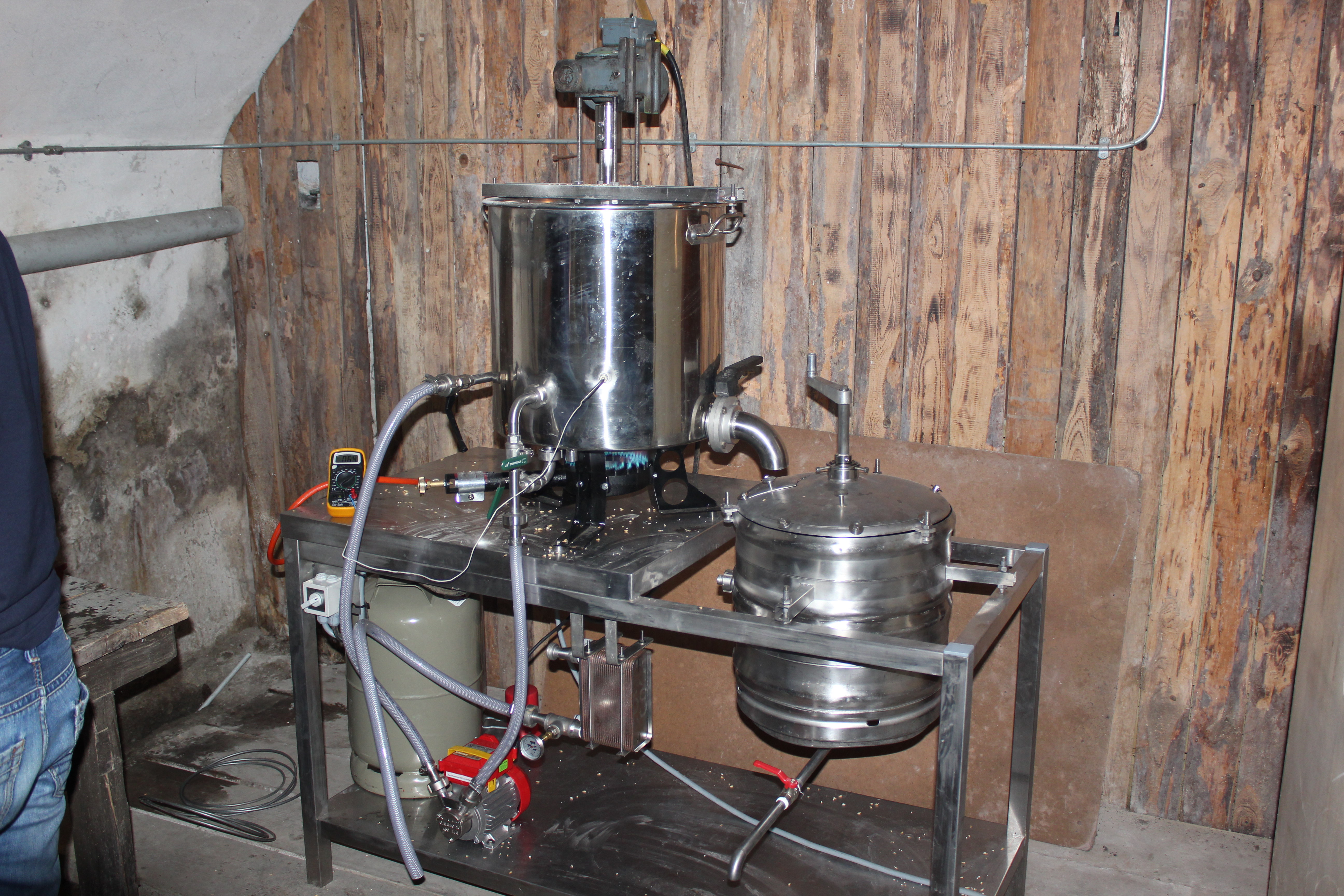 - Kombinierte Maisch-Würze-Whirlpoolpfanne, Befeuerung mittels 7,5 KW Gasbrenner, Rührwerk mit 380V Getriebemotor (150U/Min, bischen schnell genug)