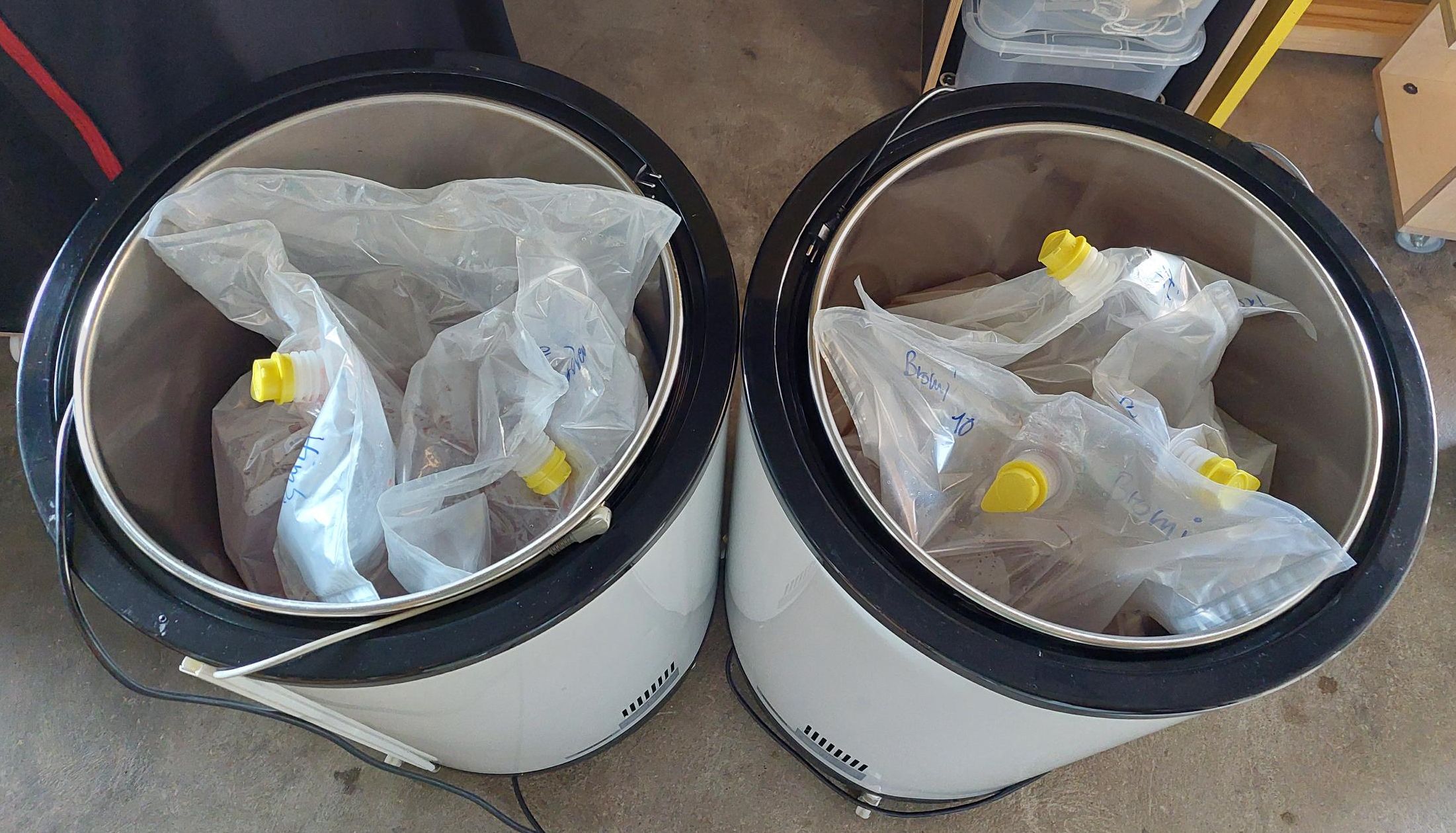 Am Ende konnte ich 55l mit 10°P Stammwürze in 6 Bag-in-Box-Beutel schlauchen. Diese habe ich dann mit Fruchtzusätzen versehen: