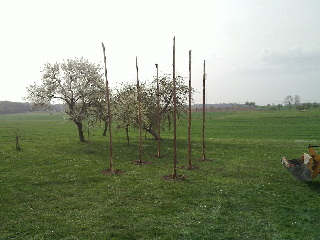 Ich hab bei mir im Garten 12 Alustangen je 8 m Einbetoniert. An diesen MAsten ziehe ich jeweils 4 Seile hoch . An denen kann sich der Hopfen schön hochranken und ich spar mir das Geld für weitere Stangen. Komme somit auf 36 Hopfenpflanzen. Sind jetzt seit 3 Jahren im Boden. Freue mich schon auf die Ernte dieses Jahr!