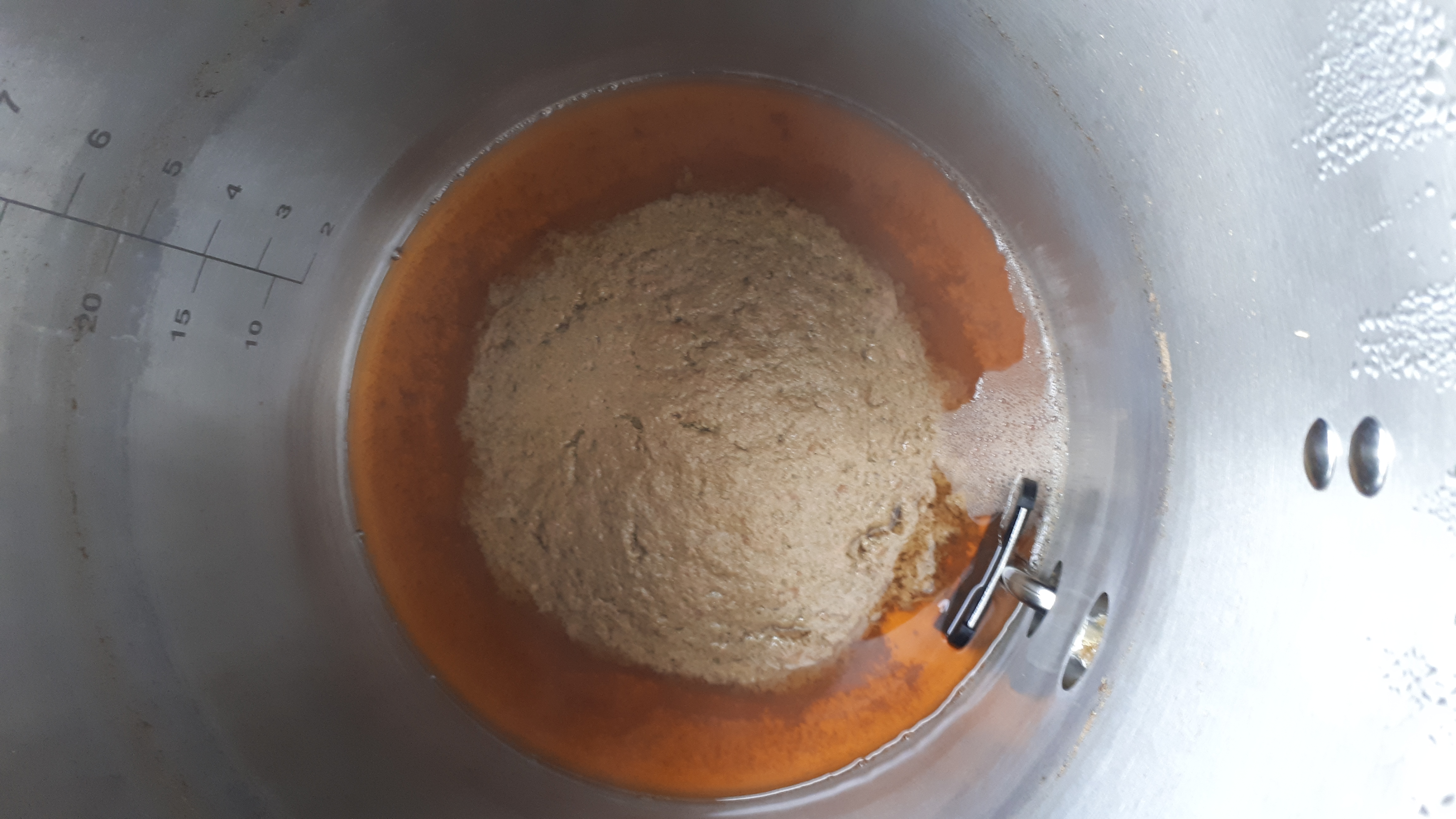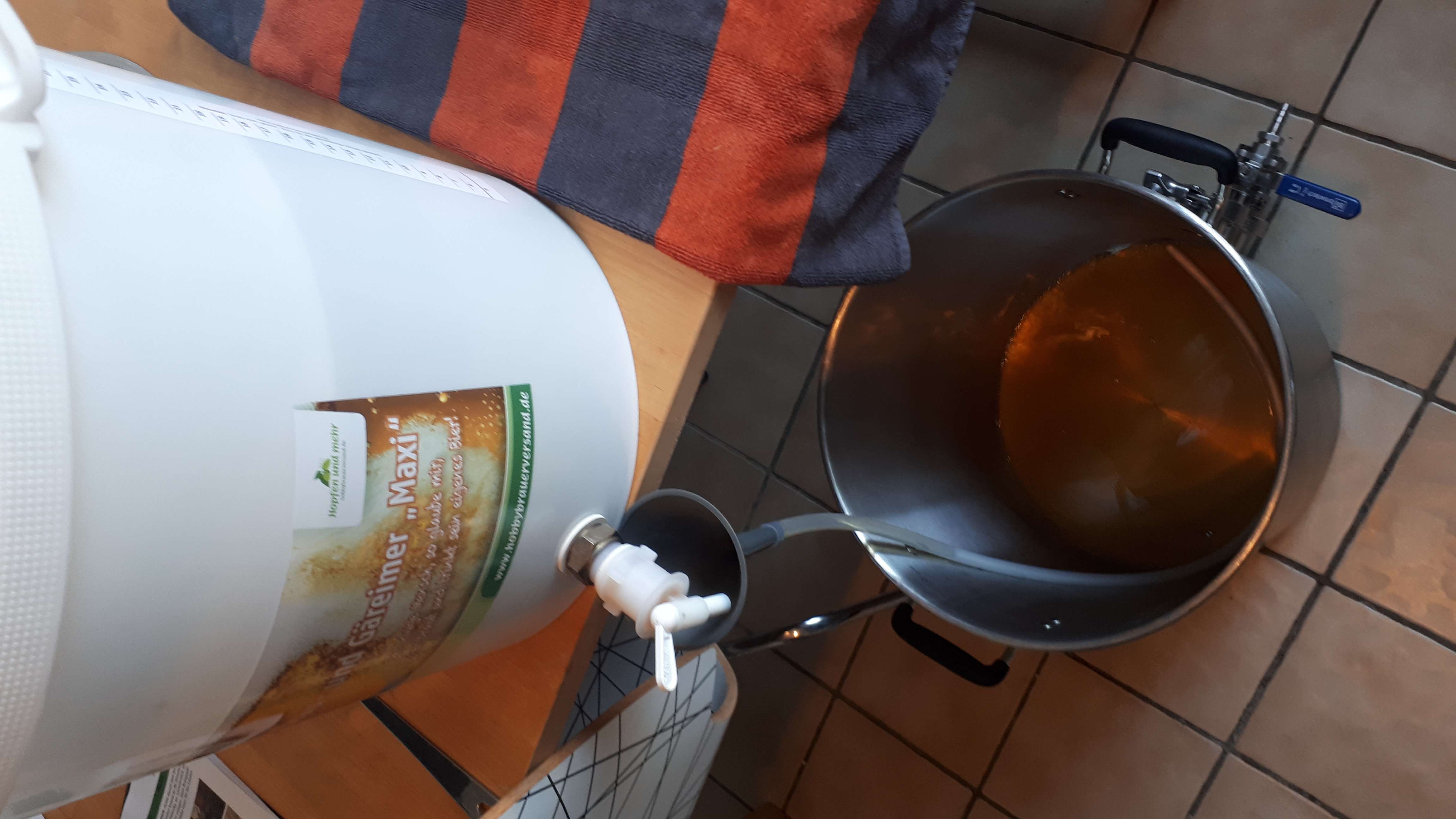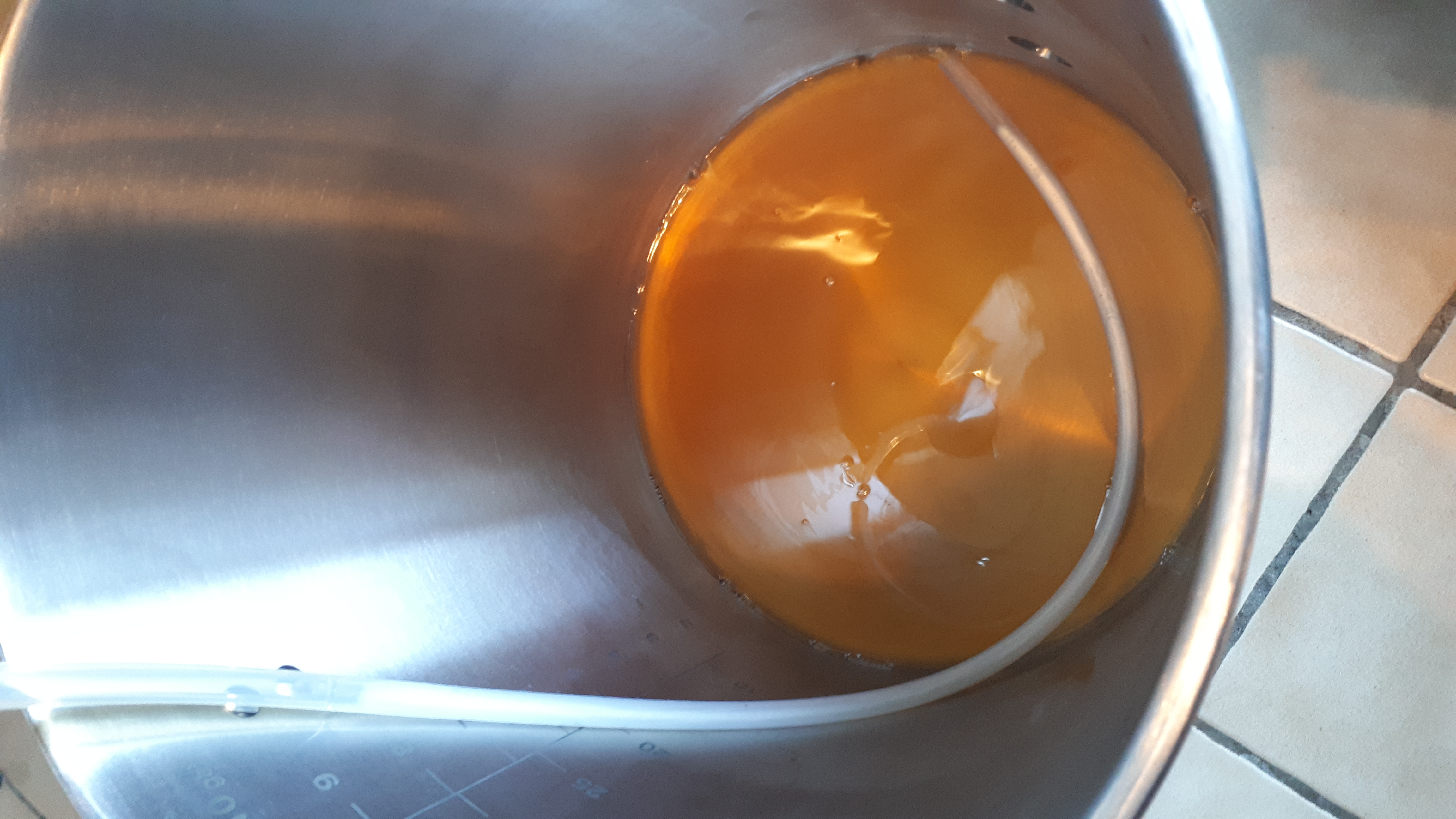 am Ende waren nach verdünnen mit abgekochten Wasser ca. 20 Liter Würze mit 13° Plato im Gäreimer.