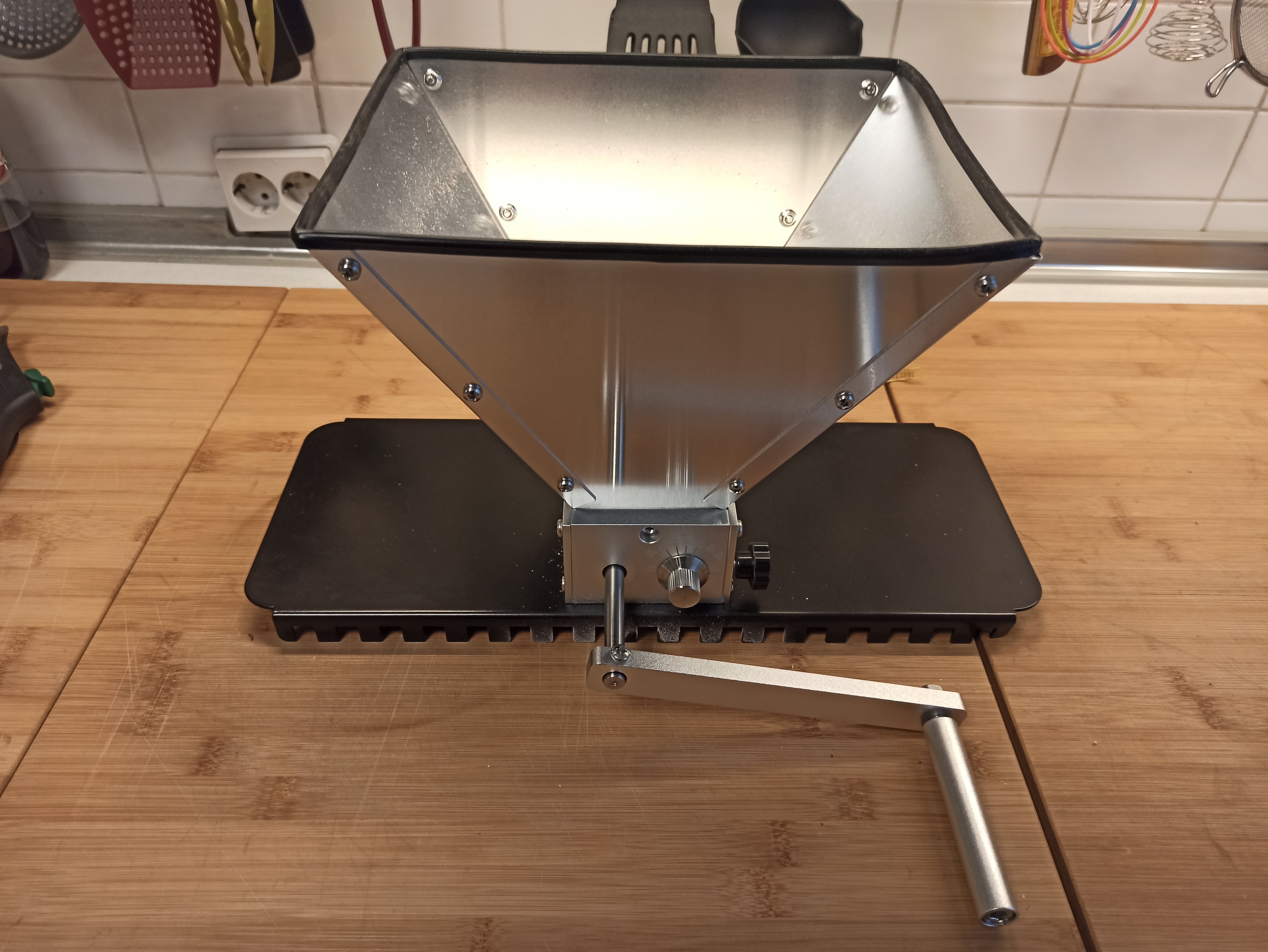 Aufbau: Total einfach, man braucht nur den Trichter aus 4 Einzelteilen zusammensetzen und auf die Walzmühlen aufsetzen. Die 4 Trichterseiten werden zusammengeschraubt, sodass nichts mehr wackelt.