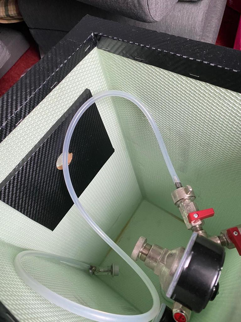 Mit dem Druckminderer passt das genau. Ich habe in dem Deckel auch noch einen Absatz drinnen, dann verrutscht der Deckel nicht und da sind auch die Batterien für die Beleuchtung drinn. Da wo die Zapfamatur durchkommt habe ich auch noch ein dünnes Brett angeklebt, dann ist das stabiler.
