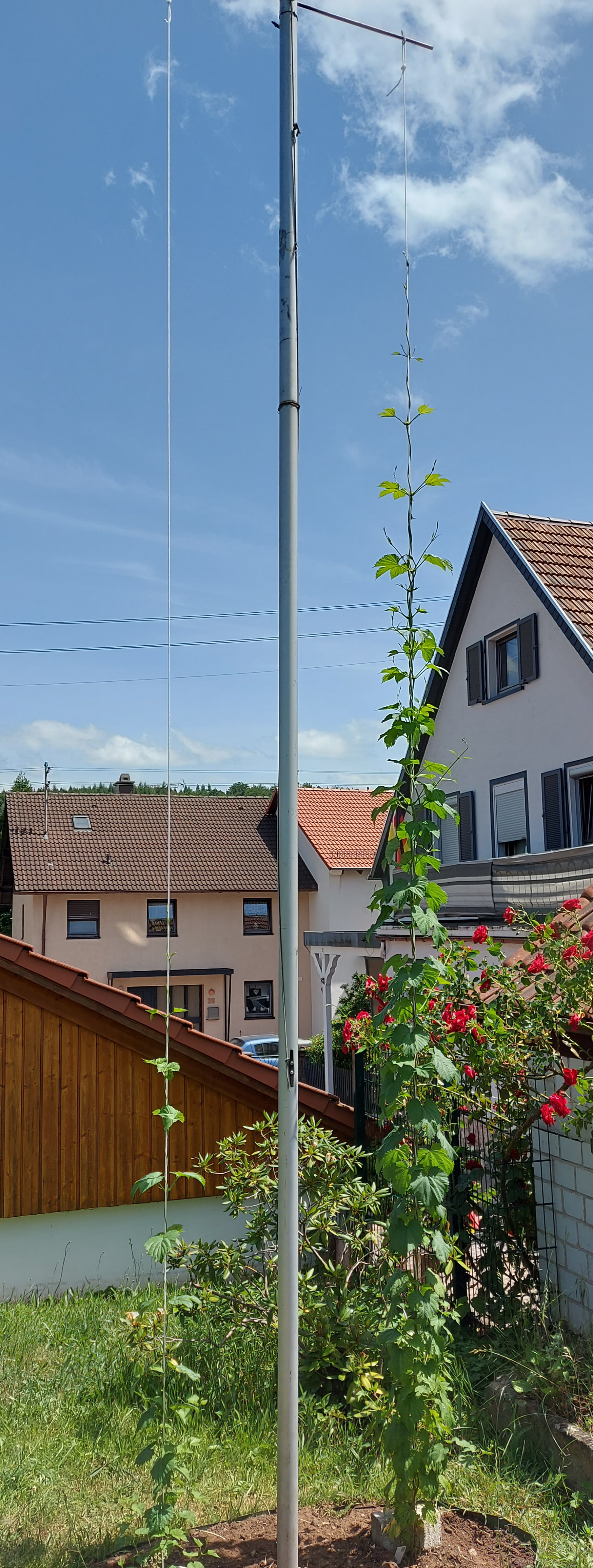 Ab wann sollte ich denn eine Rankhilfe (Schnur oder Draht) geben. Der Hopfen soll an einer 4m Stange hoch und dann darf er ca 8m quer wachsen.