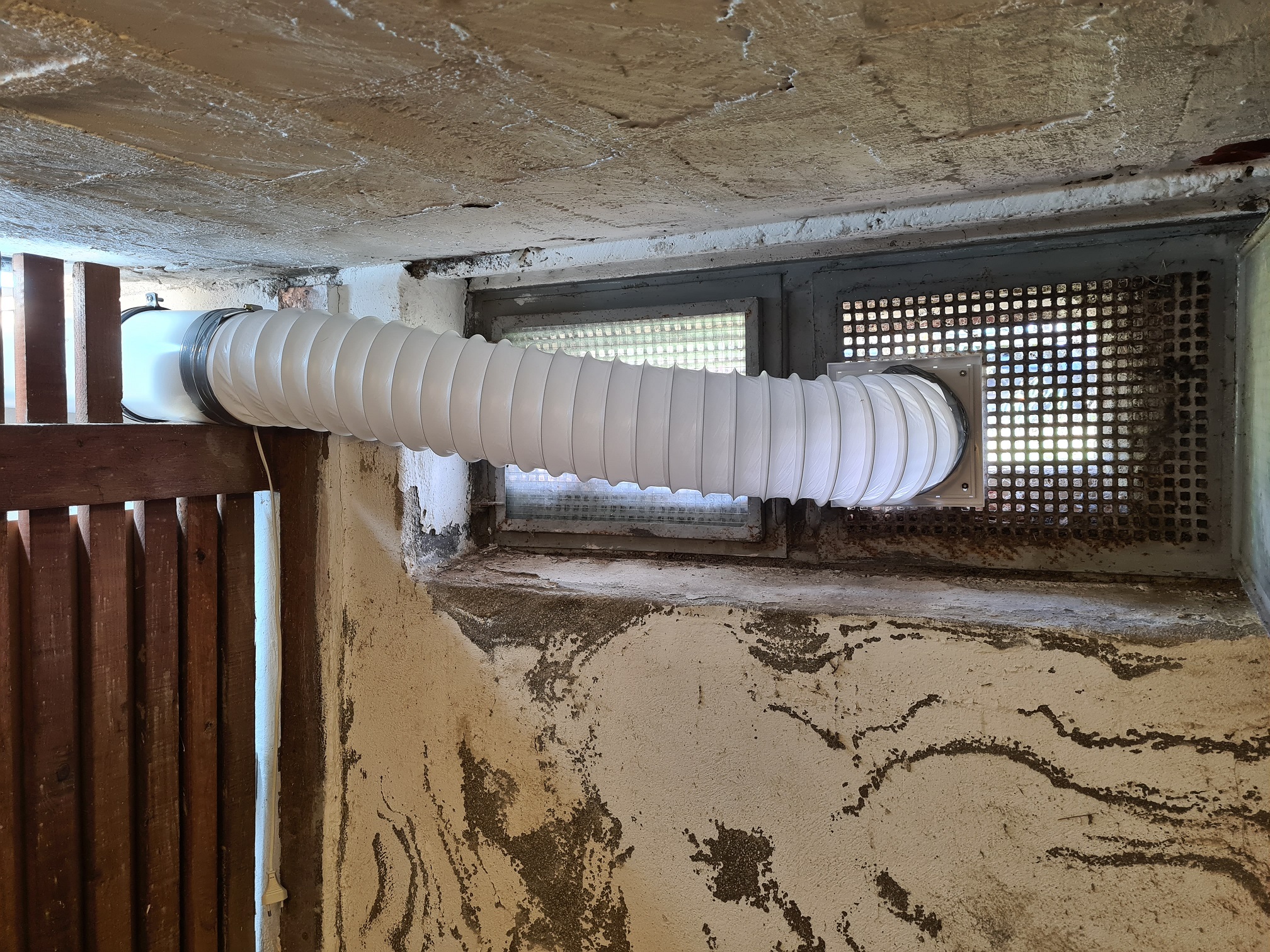 Und gestern habe ich dann noch ein Upgrade verbaut, um den Ventilator am Kellerfenster (mit begrenzter Effektivität) zu ersetzen. Ich habe für 55Eur 150mm-Rohre mit Lüftermotor (305m³/h) bestellt. Ich möchte hier keine Werbung machen, aber wer einen guten und kostengünstigen Lieferanten mit einem tollen Onlineshop sucht, kann mir eine Nachricht schreiben.