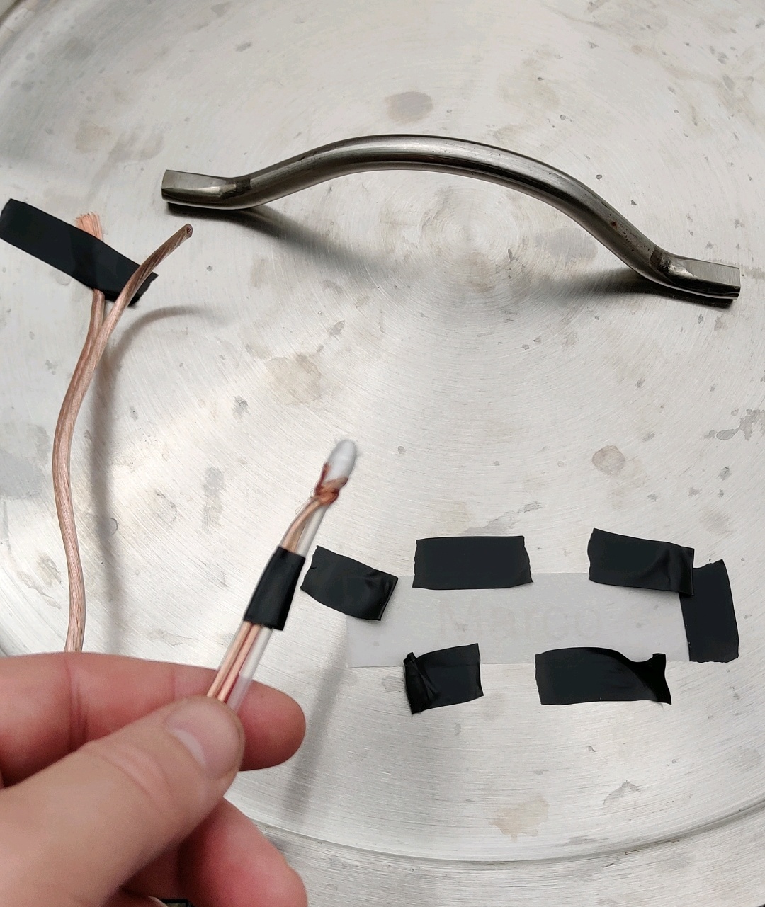 Hat bei mir gut funktioniert. Ich hatte einen alten Märklin-Trafo einer Modelleisenbahn, grob auf 12V eingestellt. Einen Pol an Q-Tip den anderen mit Duct-Tape an den Topf. Ich bin mehrfach über alle Stellen drüber. Probiere mal den Druck etwas zu variieren. Ich hatte den Eindruck weniger ist da mehr.