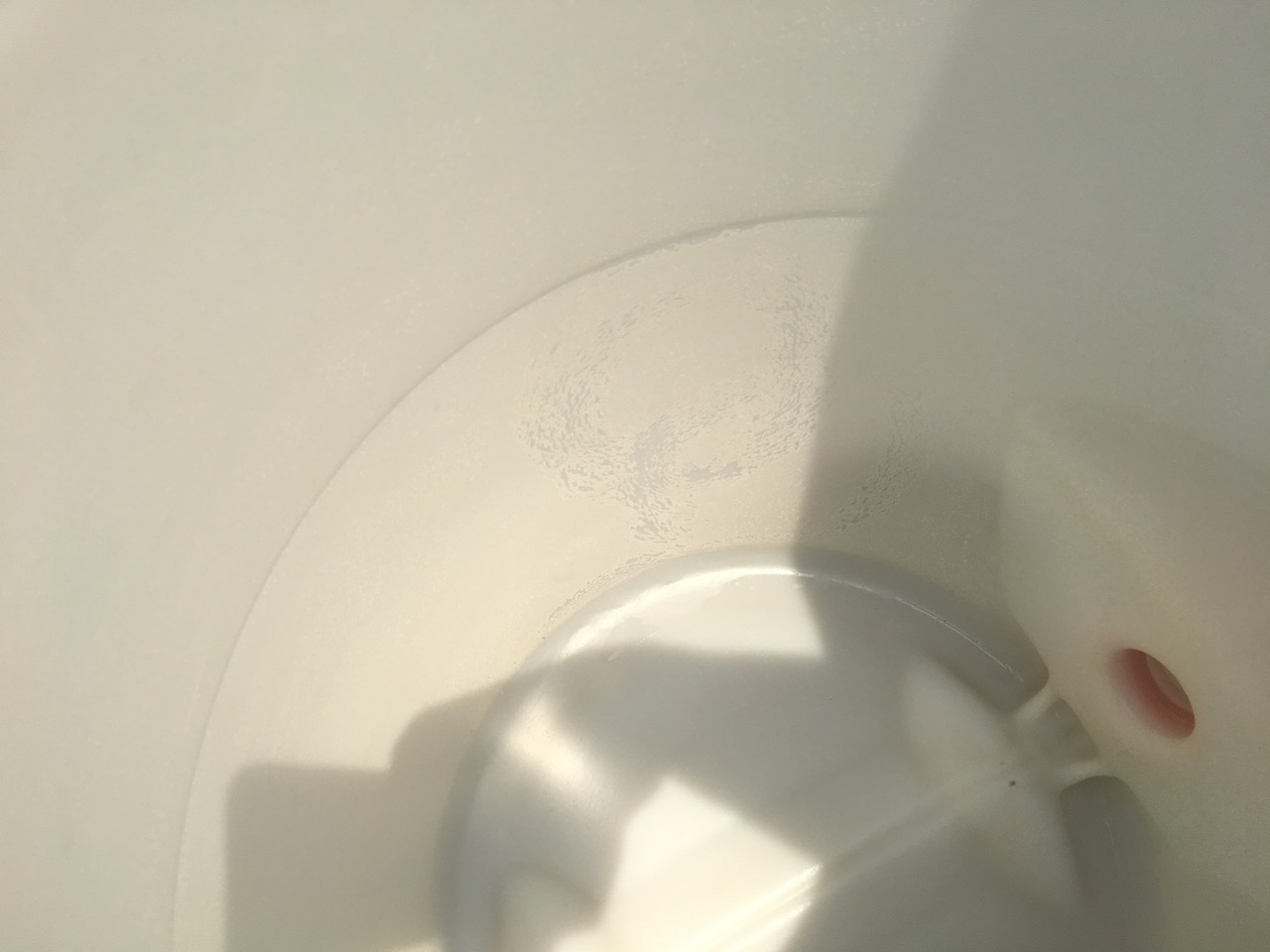 Ich habe ein meinem Speidel-Gärfass aus Kunststoff einen rauhen, weißen Belag. Vielleicht kann man das auf dem Foto erkennen. Zuerst dachte ich, der Kunsstoff ist angegriffen, aber das sieht eher wie ein Belag aus.