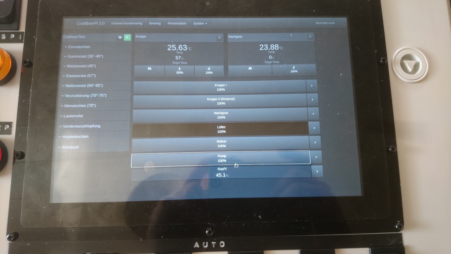 Steuerung: Funktioniert, der Spannungsregler fürs Rührwerk braucht man nicht, den für die Pumpe nicht unbedingt. Beim Trübwürzepumpen habe ich den Spannungsregler benutzt, beim Läutern wurde über den Hahn am Ausgang gedrosselt.