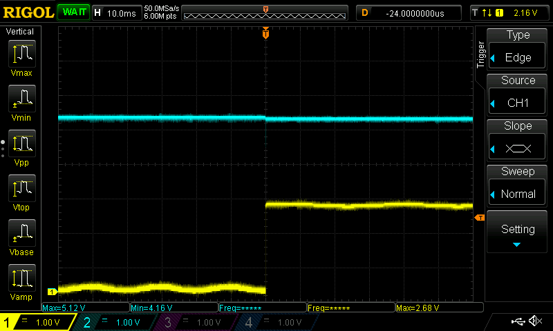 Anbei ein Bild wie das Signal am Ausgang geschwungen hat. Gelb ist die PWR und blau ist ON am Ausgang. War bei ON am Poti auch so.