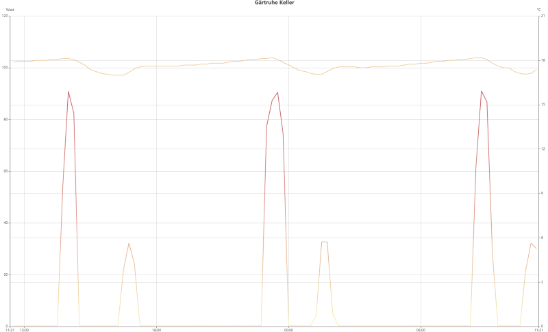 Die 30W Matte (kleine Spitze unten) fängt wunderbar die Überschwinger der Gefriertruhe (große Spitze) auf.