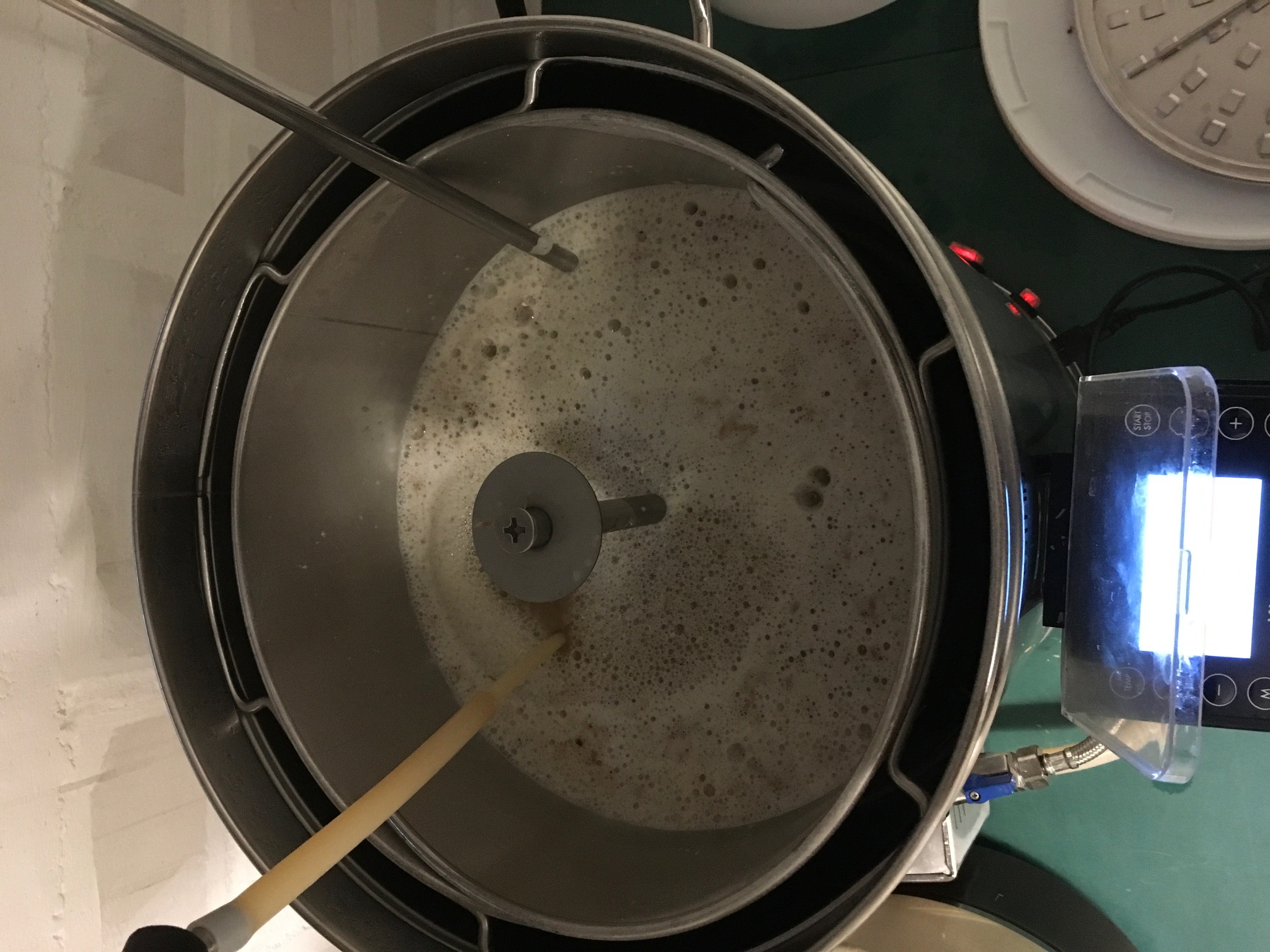 Nachtrag: es sind noch etwa 1,5 Liter abgetropft, diese habe ich während des Aufheizens noch zum Sud hinzugegeben (Koch-Volumen also etwa 34,5L). 45g Saazer als VWH gegeben, Hochheizen mit 2500W auf 100°C und dann 90 Minuten (60´ siehe unten) kochen, das sollte etwa 5,6 Liter reduzieren.