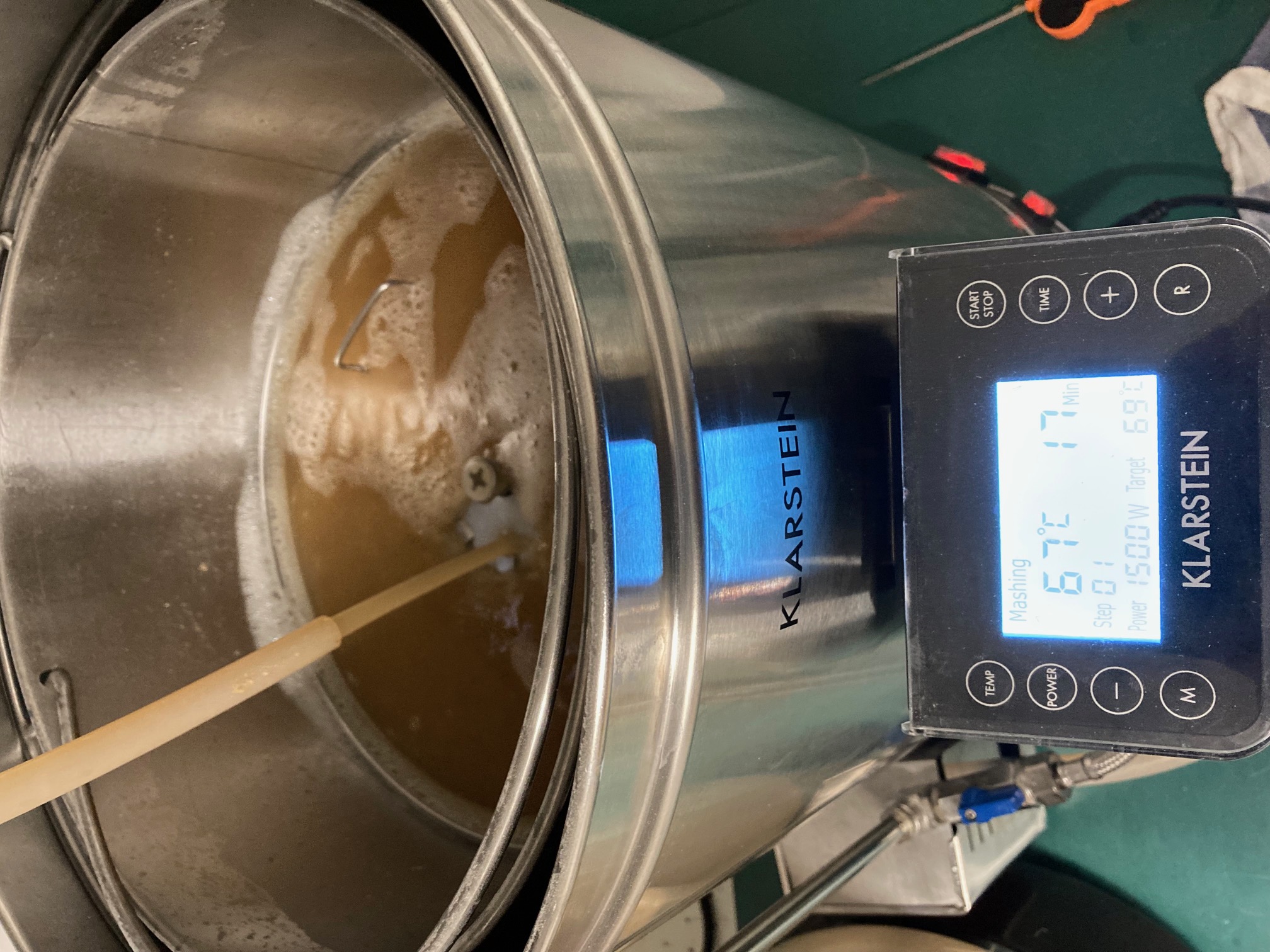 Davor: Spindel 1-1.130 g/ml, Feinwaage, Refraktometer, Pipetten 3ml Von Links: Nachgusswasser-Einkocher (geerbt), 40l Purania als Brauwasser, mein Brauheld Pro 35l Starter MJ M84, gerührt, angestellt mit 2l Starter gehopfter Würze mit SG 1.040 für 36 Std. (Ich Depp hab das falsche Foto gelöscht, ich hatte nochmal Würze zugegeben am Vortag, dann waren es 2L (und es ist auch kräftig übergesprudelt...) pH-Meter kalibriert und getestet (Dest. Wasser bei 25°C) PH-Wert des Rohwassers. 25 Liter Wasser werden als 26,5 L angezeigt. So, 07:15 Uhr, bringe jetzt das Wasser auf Temperatur (ich nehme nur 60°), ich mache noch eine Pseudo-Eiweissrast und heize dann weiter hoch auf 67°). Während des Einmaischens rühre ich etwa 5 Minuten durchgehend, dabei gebe ich 3ml Milchsäure (das ist der unterste Wert mit dem ich rechne) hinzu und nehme nach etwa 3 Minuten eine Probe und messe den pH (5,5-5,6), daher gebe ich noch einen ml Milchsäure dazu. Die restlichen 2ml gebe ich zum Nachgusswasser. Ab jetzt rühre ich alle 10-15 Minuten solange durch, bis sich der Flüssigkeitsstand innerhalb und ausserhalb des Malzkorbs halbwegs egalisiert hat. Dabei nehme ich regelmässig Messungen der Temperatur im Maischebett vor und rühre ggf. nochmals durch. Alle 15 Minuten nehme ich Refraktometer-Proben von der Würze und bestimme den Wert, um zu sehen, ob ich mit der Extraktion durch bin. Für eine hohe Konversion zu vergärbaren Zuckern gehe ich mit der Maltose-/Kombirast über die lange Zeit von 75-90 Minuten und nutze dabei auch die Grenzdextrinasen voll aus um einen hohen EVG und ein schlankes Bier zu bekommen. Nach etwa 80‘ auf 72°C Hochgeheizt und den Deckel aufgelegt, Refraktometer zeigt 1.067 (hätte mir 1.070 oder mehr gewünscht) es bleibt spannend. 09:11 Die Maische ist jetzt nur noch leicht Opal-trüb und Jod-normal () 09:20 Zum Abmaischen 10‘ auf 78°C,