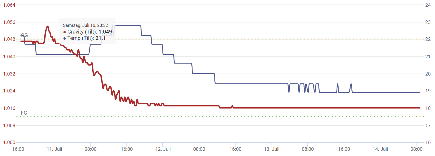 Braufex hat geschrieben: Montag 12. Juli 2021, 23:19 Lass Dich vom TILT nicht täuschen. Gerade bei Hefen mit hohen, festen Kräusen (wie die 3068) wird der Tilt (oder bei mir die iSpindel) in der stürmischen Zeit der Hauptgärung oft von der Hefe "geführt"; das heisst in der Lage verschoben. Das legt sich am Ende der Gärung meist wieder. Kann also gerade auch zufällig genau passen.