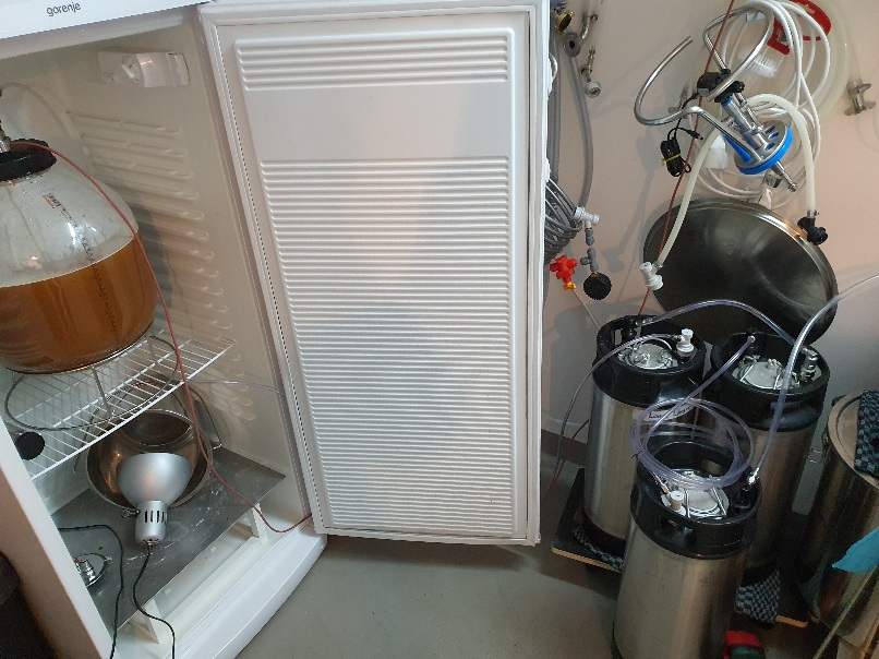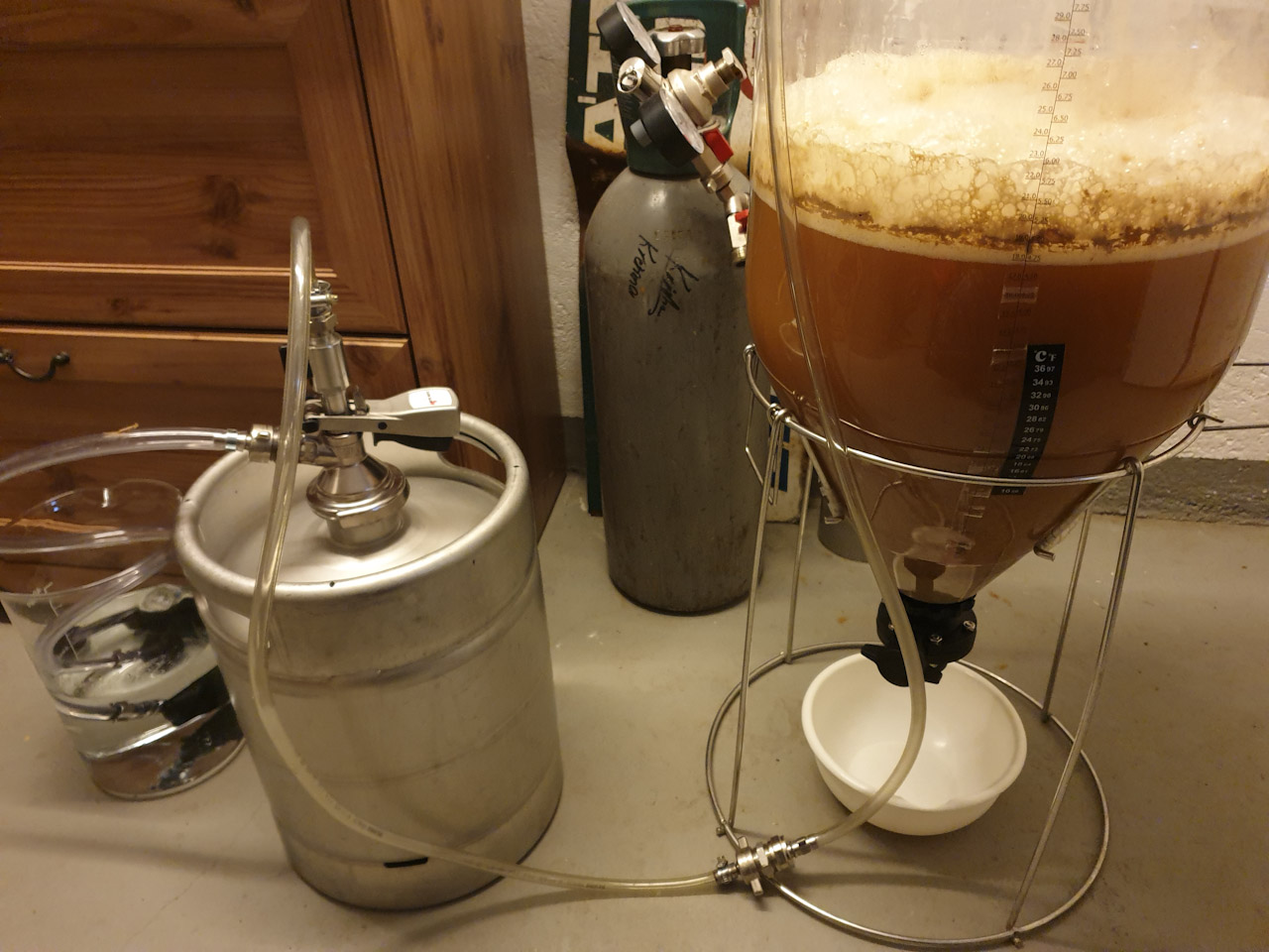 Nun mache ich das mit Gärkohlensäure. Während des Brauens reinige ich nebenbei geleerte Kegs. Diese fülle ich wie bisher auch am Ende mit Wasser. Nach dem Anstellen kuppel ich das erste Keg mit dem Gärbehälter und verbinde den Rest in Reihe. Am Ende der Gärung sind alle Fässer mit Co2 geflutet und ich setz beim letzten einen Spund drauf sodass alle Behälter auch noch nen dezenten Druck oder auch gleich entsprechend des gewünschten Spunddrucks beaufschlagt werden.
