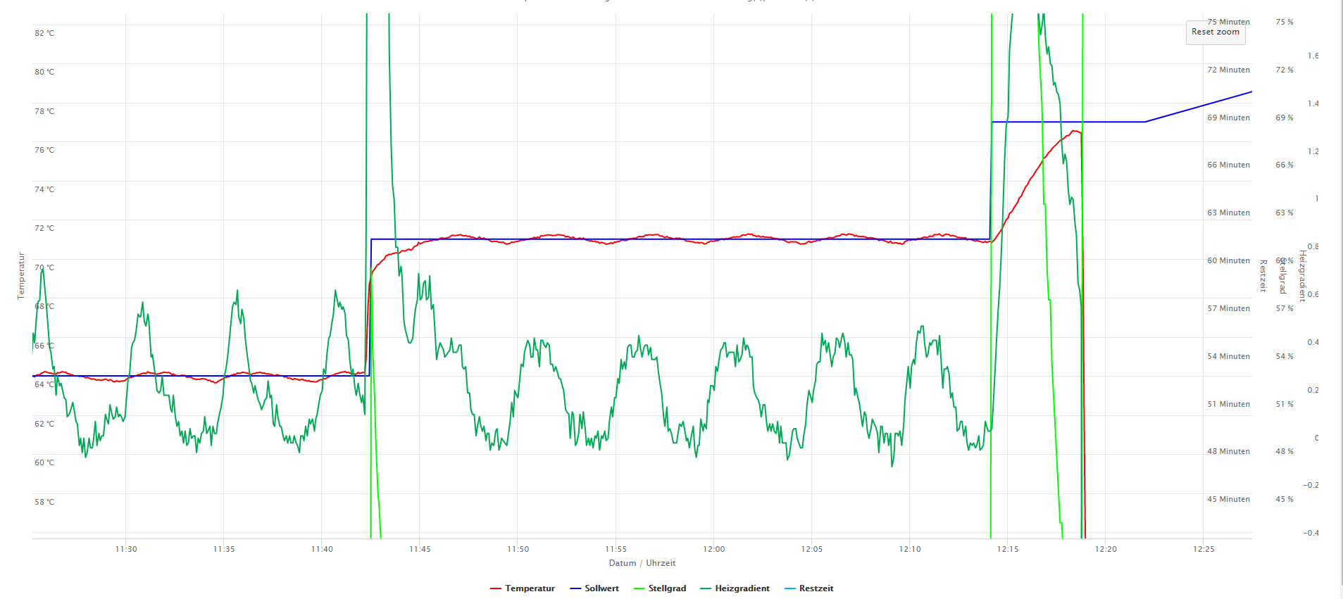 Zugegeben, der PID-Regler ist ziemlich umständlich und bei einer so langsamen Regelstrecke nicht wirklich viel besser (zumindest wenn eingeregelt?) als ein Zweipunktregler. Aber aus Interesse habe ich mir das PID-Tuning mal angetan.