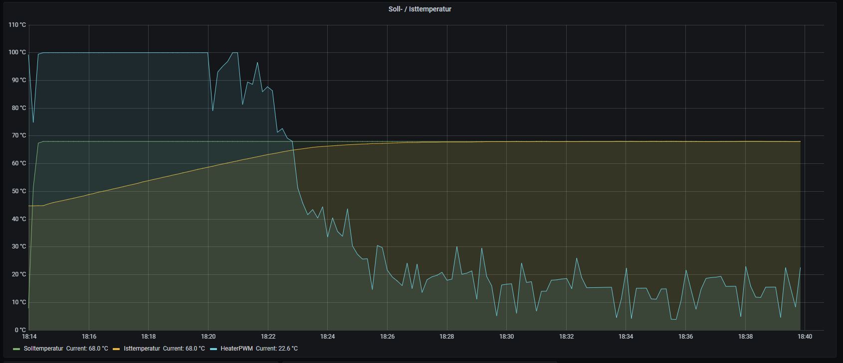 Das mit der automatischen Ermittlung der PID-Werte hat nicht allzu gut funktioniert. Das Problem was zumindest ich dabei hatte, ist, dass die Werte zu ca. 1 °K Überschwingen geführt haben. Die Regelung hat sich dann erst nach 10 Minuten wieder eingeregelt.