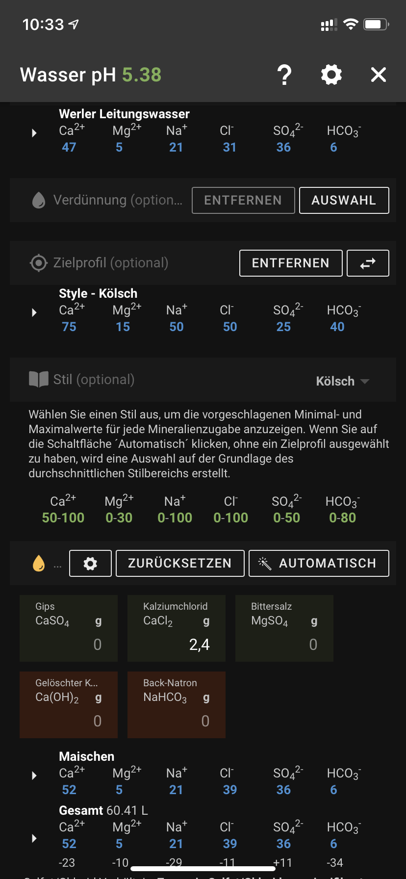 Wollte gleich ein Wiess brauen. Im Anhang ein Wasserprofil Auszug aus Brewfather. Werler Leitungswasser ist eingestellt, einziger Wert aus dem ich nicht schlau werde ich HCO3. Wegen der Wasseraufbereitung, 60 Liter BIAG, gibt mir BrewFather 2,4g CaCl an, das habe ich allerdings in flüssiger Form. Soll ich das dann abmessen? Oder stattdessen 2,4ml nehmen? Was haltet ihr ansonsten von dem Wasser?