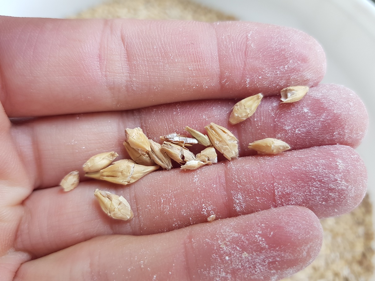 Die Körner, welche ganz erscheinen, sind angequetscht und bröseln auseinander, sobald man sie zwischen zwei Finger nimmt. Beim Braumeister lieber etwas gröber schroten, zu fein bringt verschiedenste Probleme mit sich.