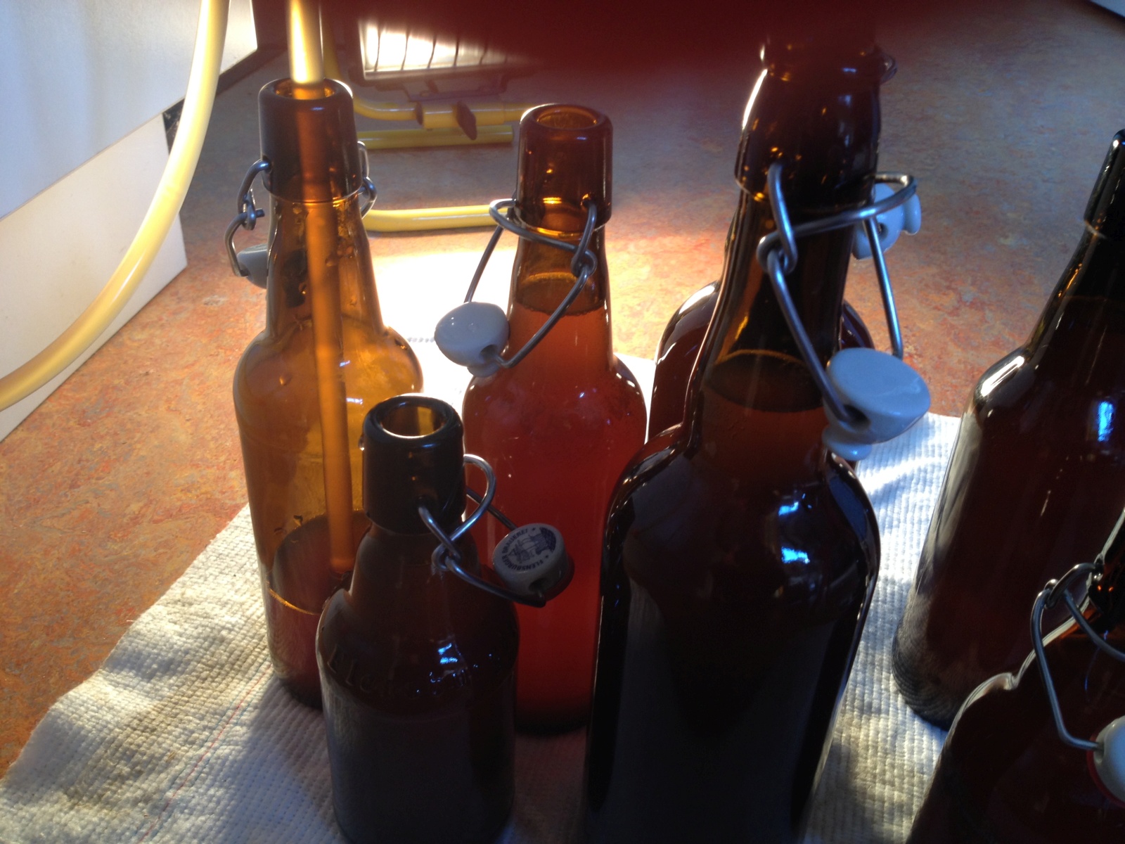 Jupp, ich habe auch immer eine Lampe dahinter stehen. Ohne ist das schon schwierig.So und nun geht's in die Flaschen. Habt Ihr auch so eine Abfüllleuchte, damit man den Füllstand in den braunen Flaschen gut sehen kann, und nicht so viel daneben geht?