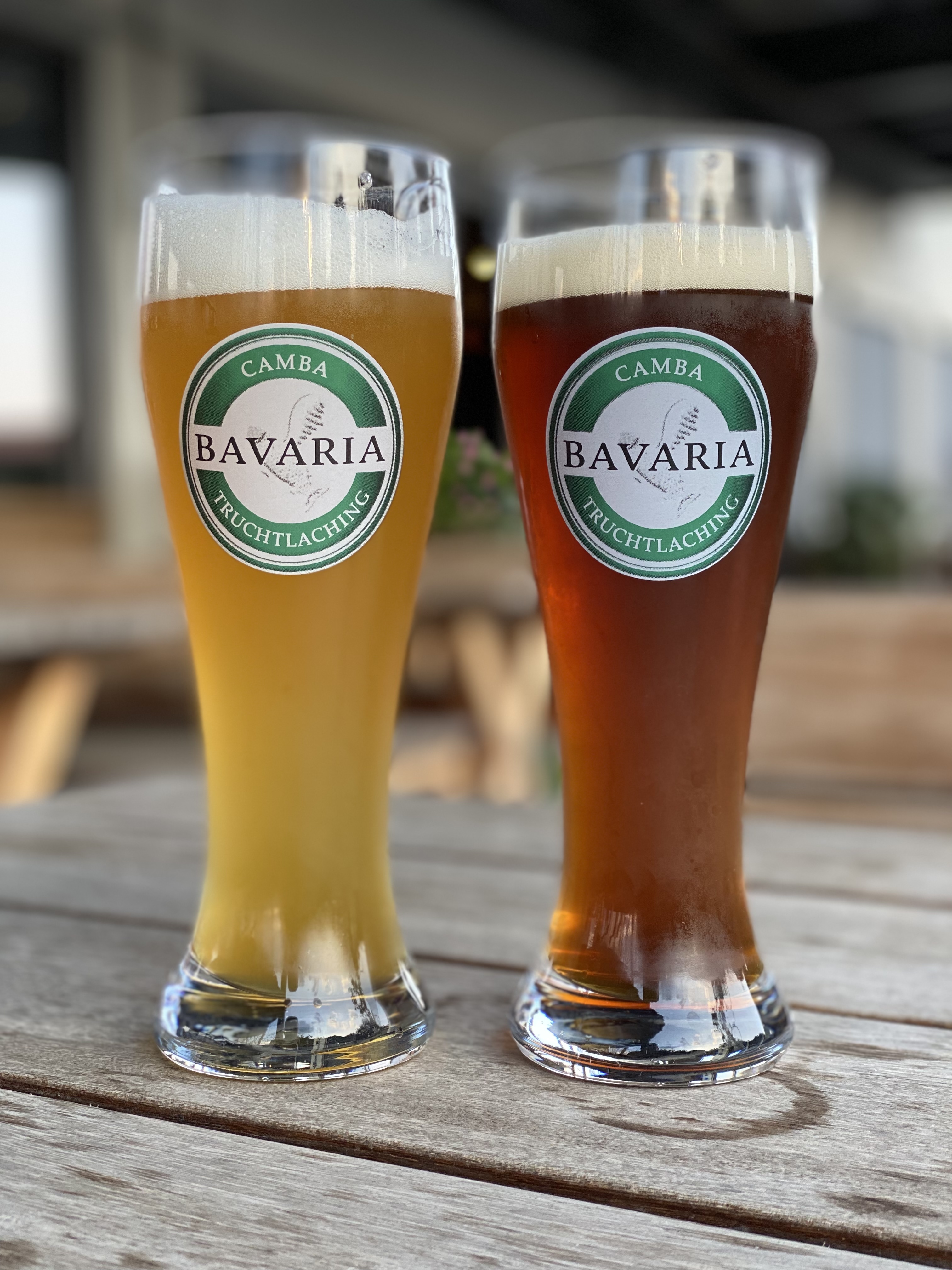 Ein Dunkles und ein Helles der Klosterbrauerei Baumburg. Natürlich geteilt mit der mitradelnden Mitbrauerin. Stilecht im Klostergarten mit Glockengeläut.