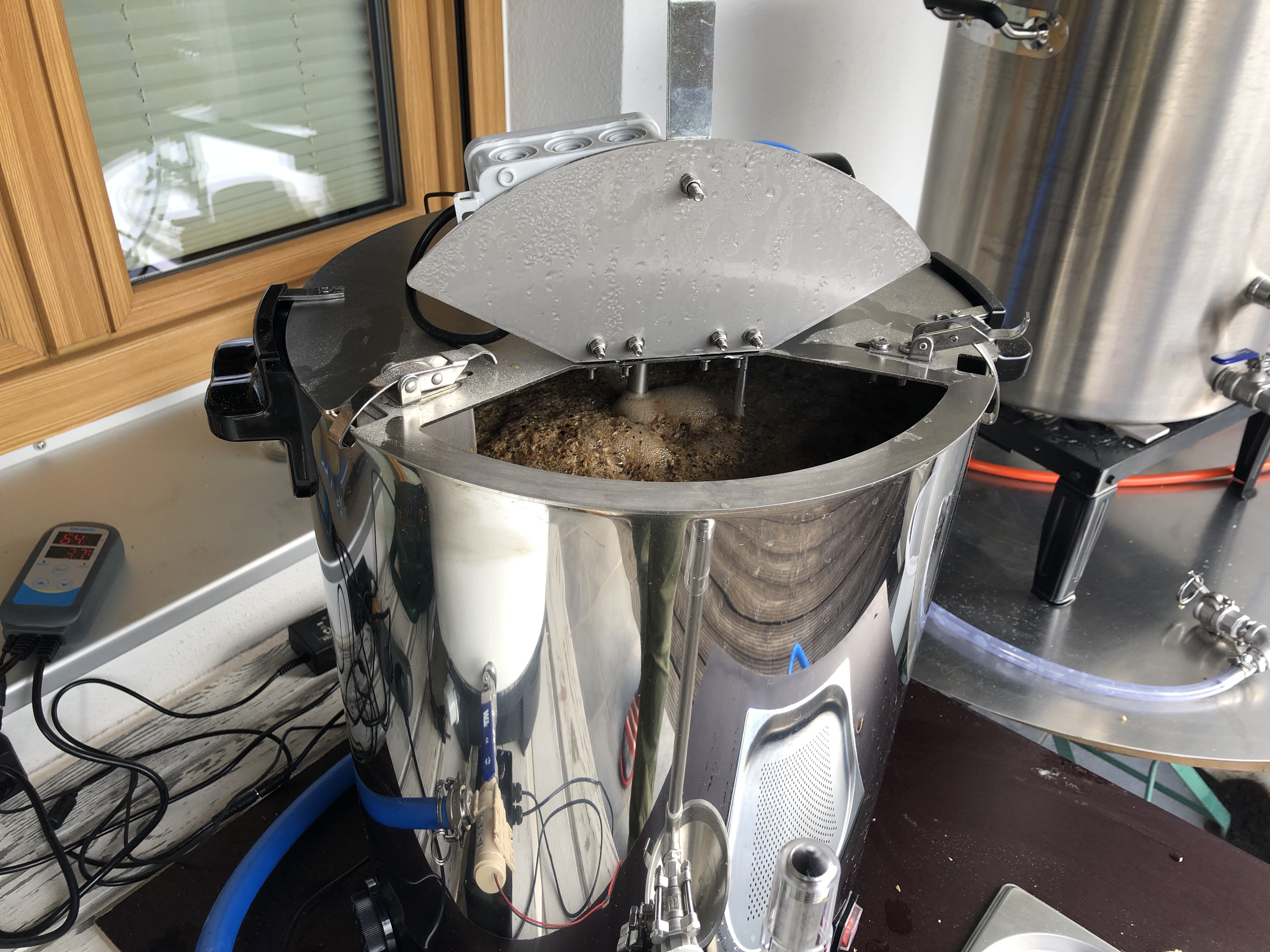 Mein Equipment wurde etwas angepasst mit Prallblech und Verlängerung des Rührwerks, damit das auch beim Konfistar kurz über dem Boden die Maische bewegt. Außerdem habe ich den Heißwasserschlauch vom Nachgusstopf gegen einen Brauereischlauch getauscht. Der alte Schlauch roch etwas nach Gummi, obwohl der bis 120 Grad hitzebeständig sein soll…