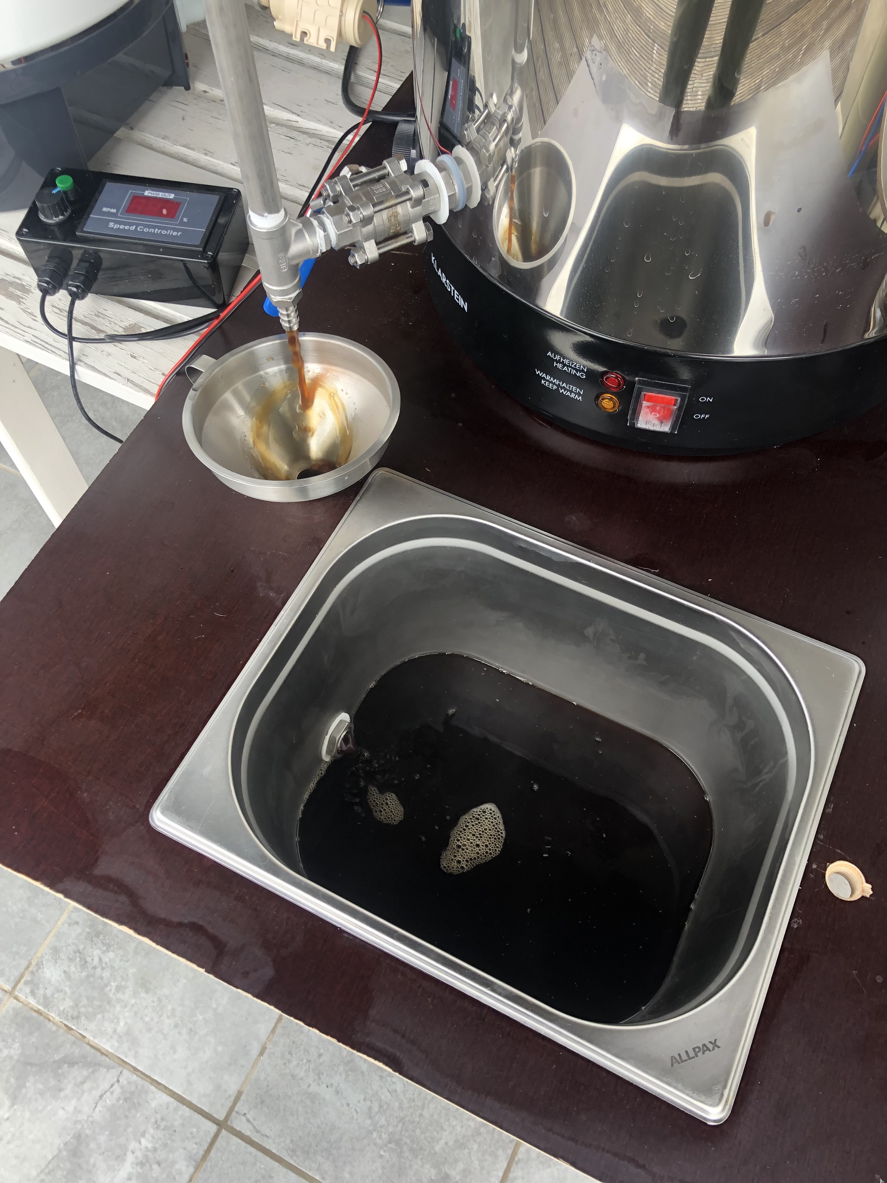 Nach der Läuterruhe (und dem Mittagessen) ging’s weiter mit dem Läutern; hier hat es bis zum Klarlauf ewig gedauert, aber danach lief es sehr flott durch. 25L Nachguss kamen noch dazu.