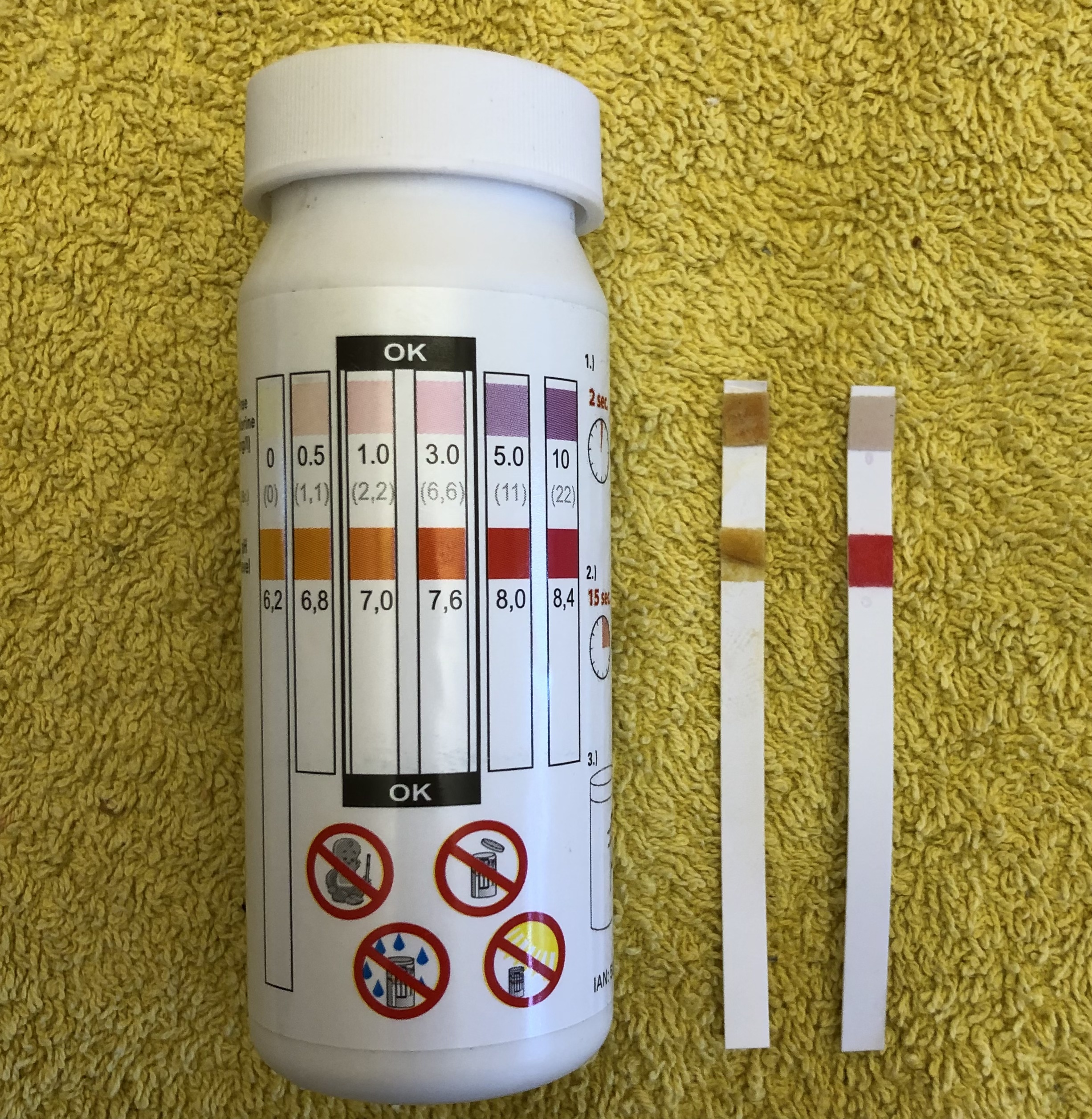 Das mit dem pH ist tatsächlich irgendwie Rätselraten aufgrund der Färbung. Besser wäre ein pH-Meter. Gut justiert ein besserer Anhaltspunkt.