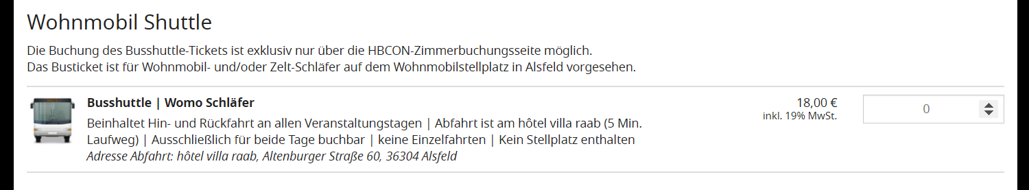 Bierwisch, mit Busanbindung ist das Shuttle gemeint. Hier buchbar für 18 €: https://pretix.eu/hotelschlossromrod/zimmerhbcon/