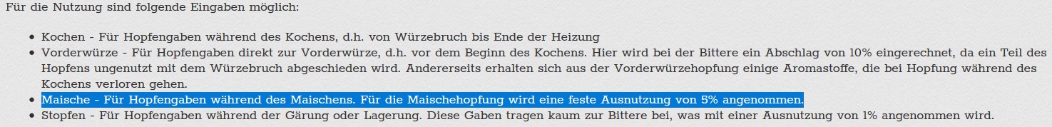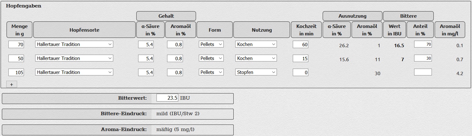Hier meine Hopfung bei meinem Standard-Lager (ohne WP-Hopfung o.ä.) Möchte ich nun einen Aroma-Eindruck von „mäßig“ mit 5 mg/L erreichen, ergeben sich folgende Hopfungen: