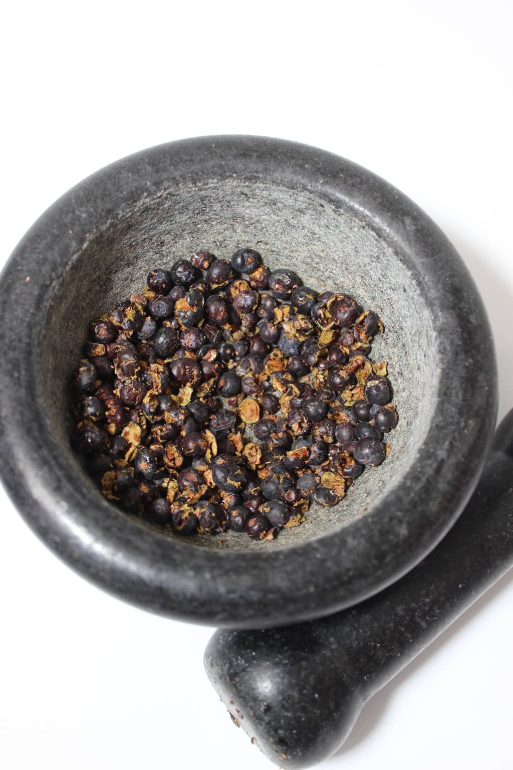 Die ersten 113g Wacholderbeeren für die Maische. Vor dem Einmaischen habe ich sie im Mörser zerstoßen.
