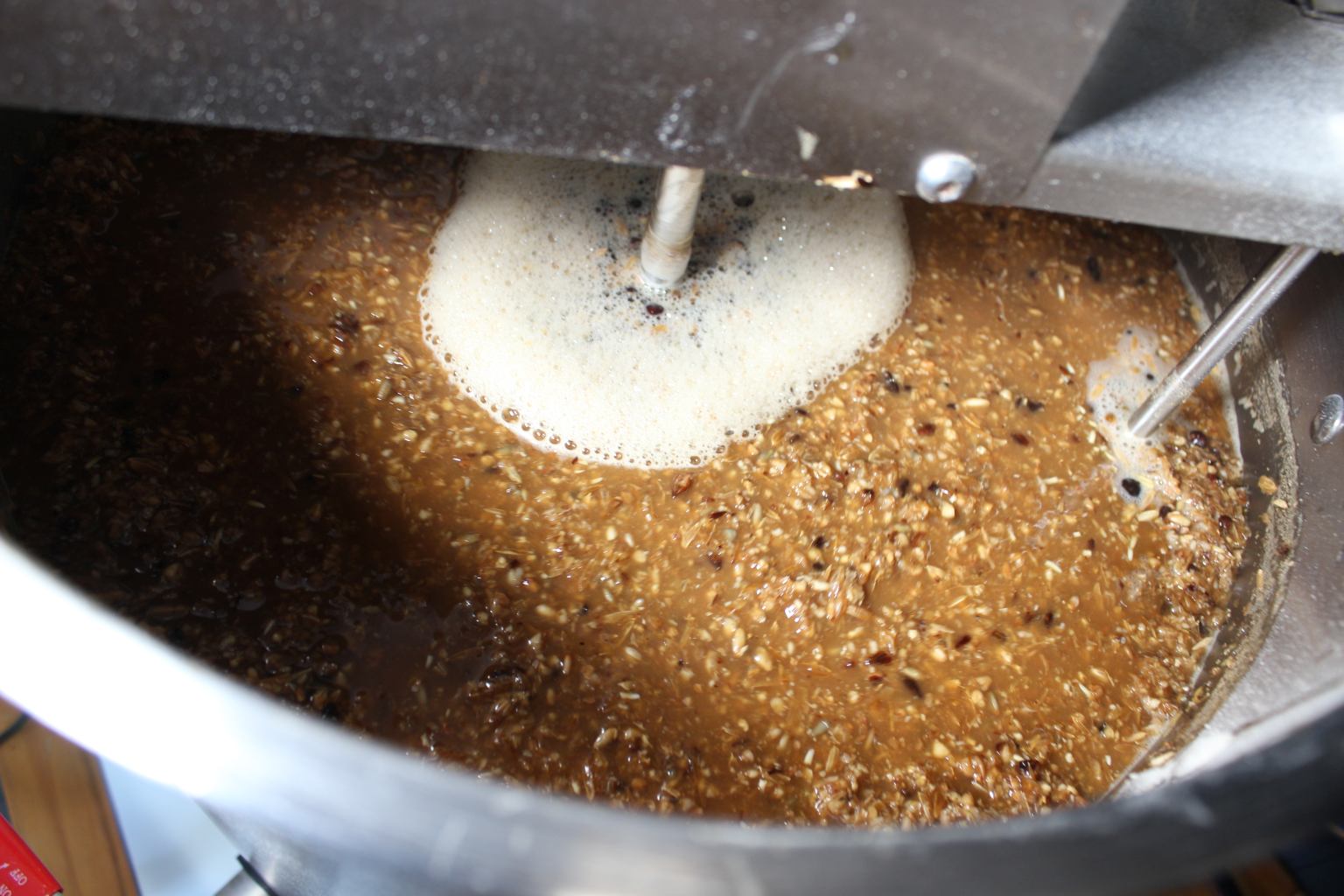 Vor den Nachgüssen schneide ich den Treber immer etwas ein.