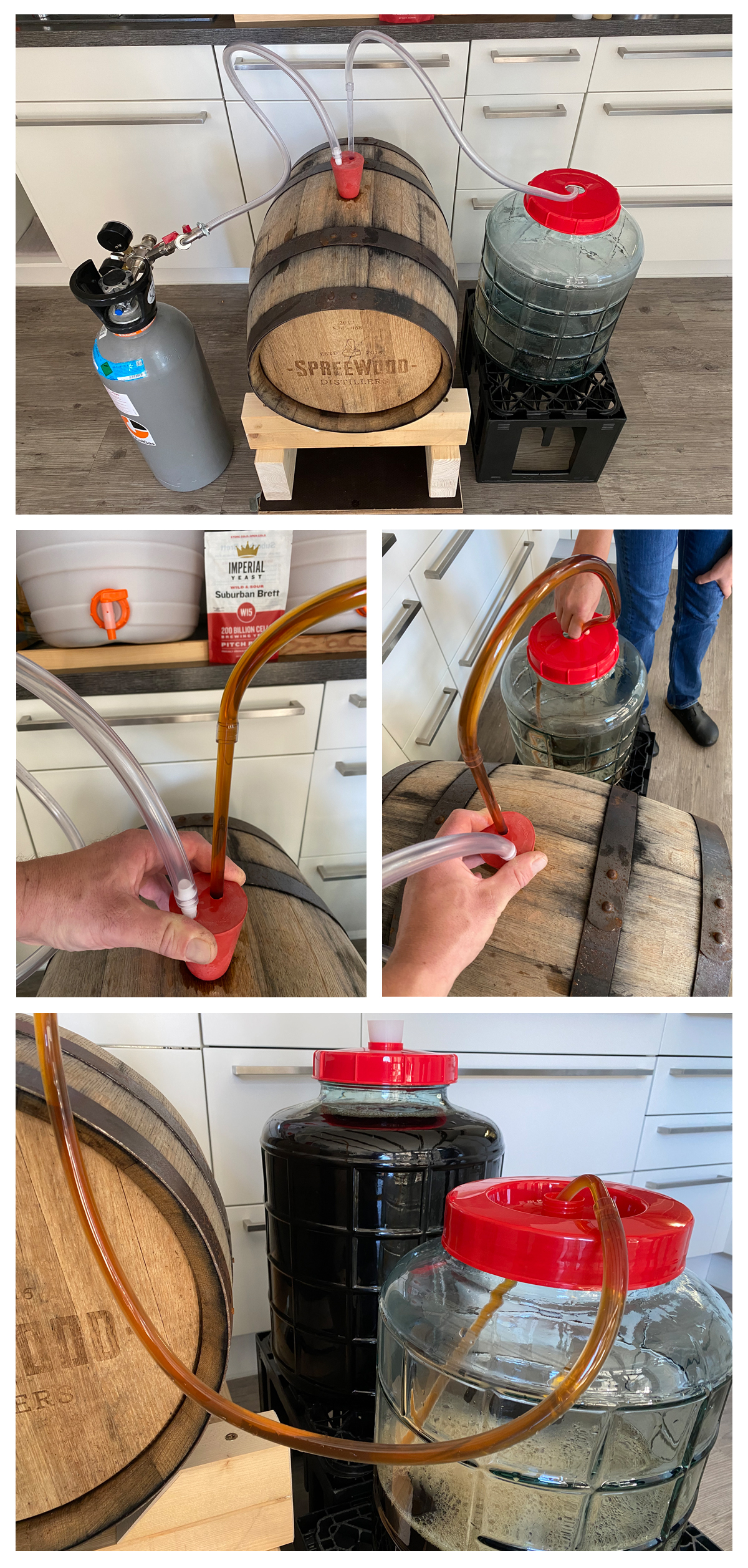 Jetzt noch der Rest von gestern. Das Salty & Sour Caramel Brown Ale musste aus dem Fass. Nach der Bierheberkatastrophe der letzten Umfüllaktion haben wir das diesmal gleich mit CO2 aus der Flasche gemacht. Steigrohr vom Bierheber, ein Stopfen mit zwei Löchern und fertig ist der "pressurized racking cane". Ging diesmal gut und das Bier ist schön klar. Zwei Glasbehälter sind voll geworden und in einem dritten ist noch ein kleiner Rest, der heute oder morgen in die Flaschen wandert. Das Bier im großen Behälter haben wir mit einer Packung Suburban Brett versetzt. Mal sehen, ob die der Säure noch etwas Paroli bietet. Das Bier hat ein wahrsinnig interessantes Aroma, geschmacklich könnte da aber noch was kommen. Wird mit Brettanomyces vielleicht etwas vielschichtiger.