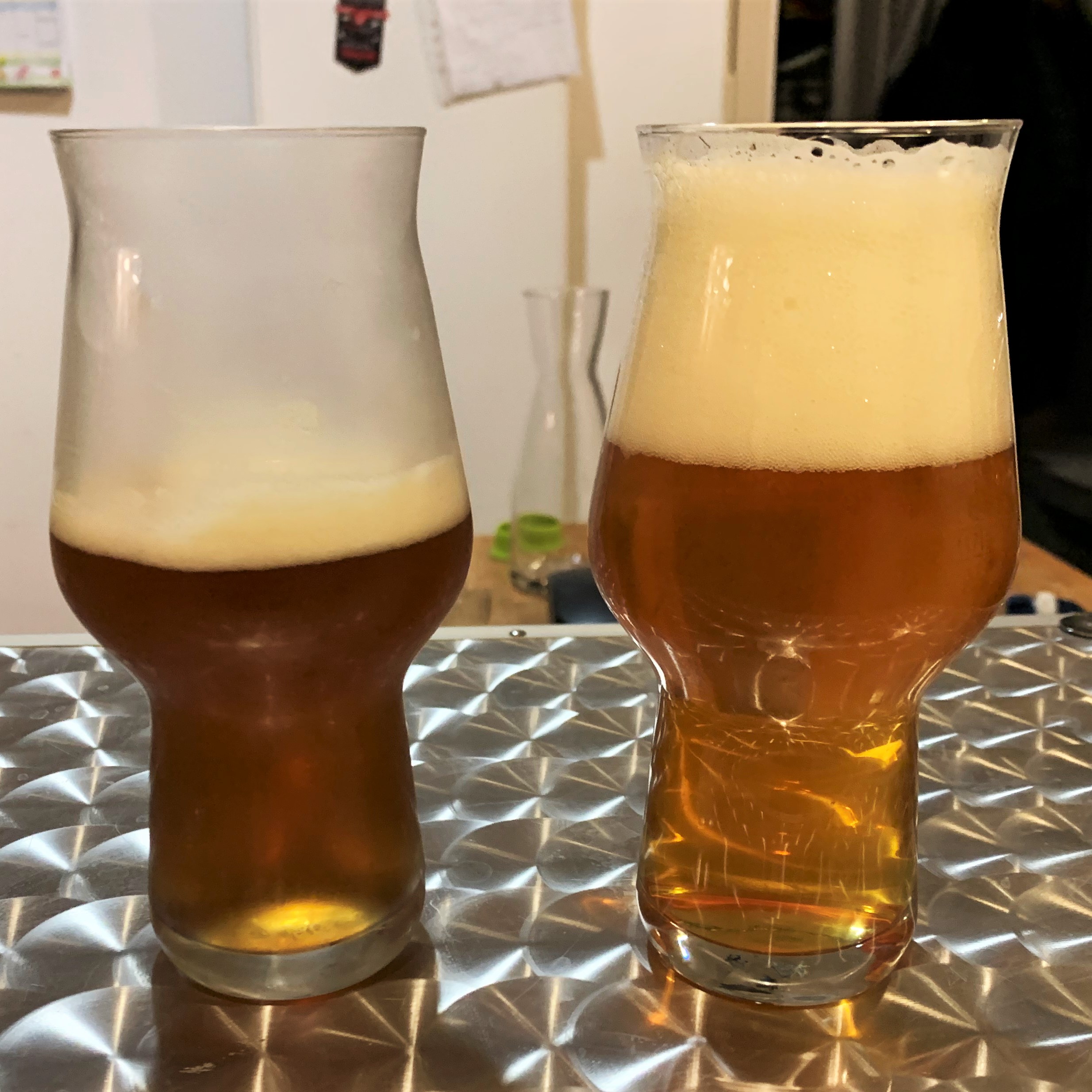 1) Ein IPA, vergoren mit der Verdant IPA, gegen Ende der HG mit 2g/l Simcoe und 1g/l El Dorado in Form loser Pellets gestopft. Das Bier aus der Kontrollflasche mit Manometer hatte deutlich mehr Kopfraum und eben keinen besonderen Kronkorken. Das andere, hellere, einen minimalen Kopfraum und eben einen sauerstoffabsorbierenden Kronkorken.