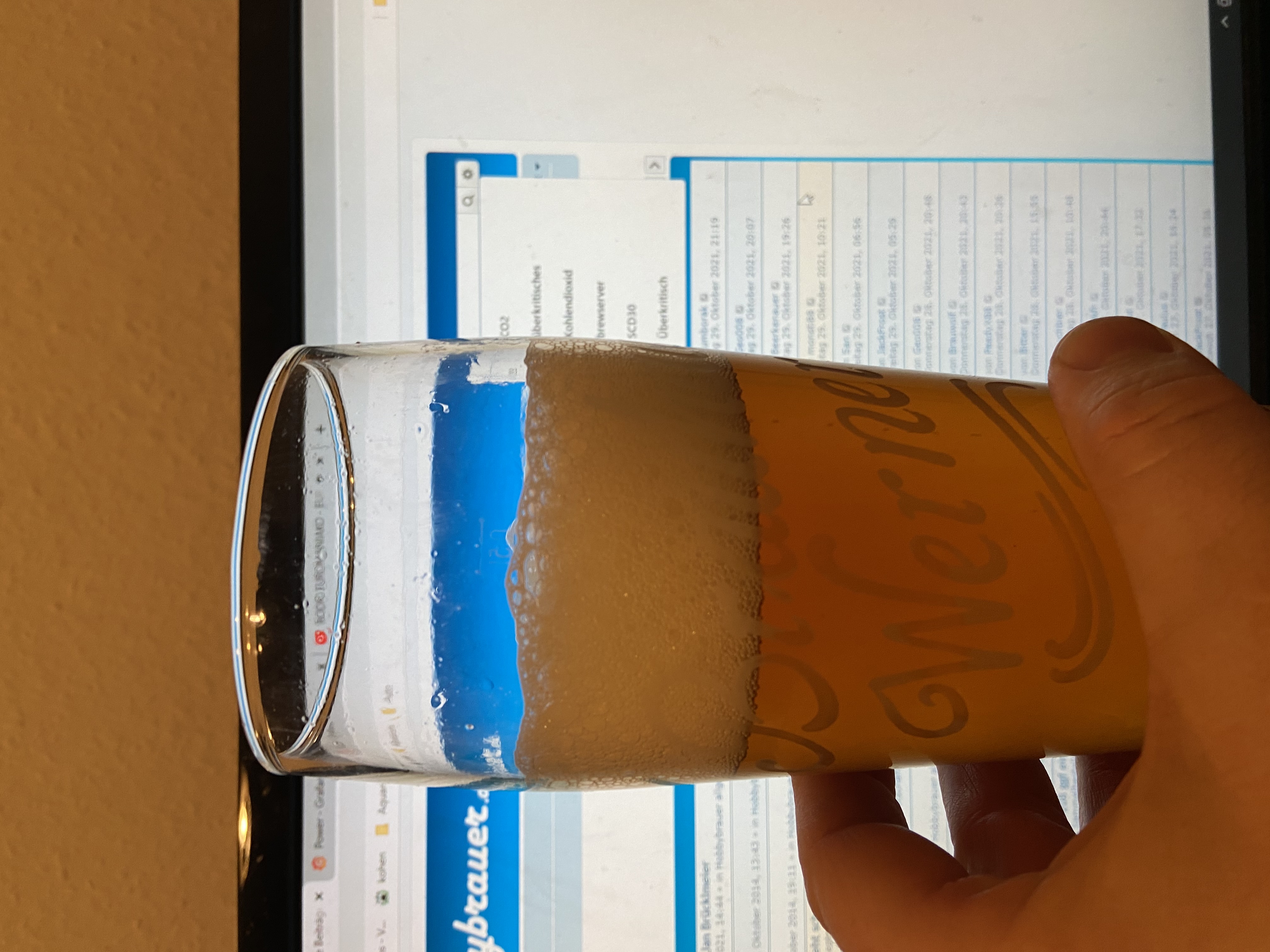 Und jetzt die erste Kostprobe meines Kürbisbiers. Is noch recht jung und etwas unrund, Gewürze sind subtil vorhanden und den Kürbis (4,5kg auf 10L) merkt man nur in der Bierfarbe. Mal sehen wie das in zwei Wochen schmeckt.