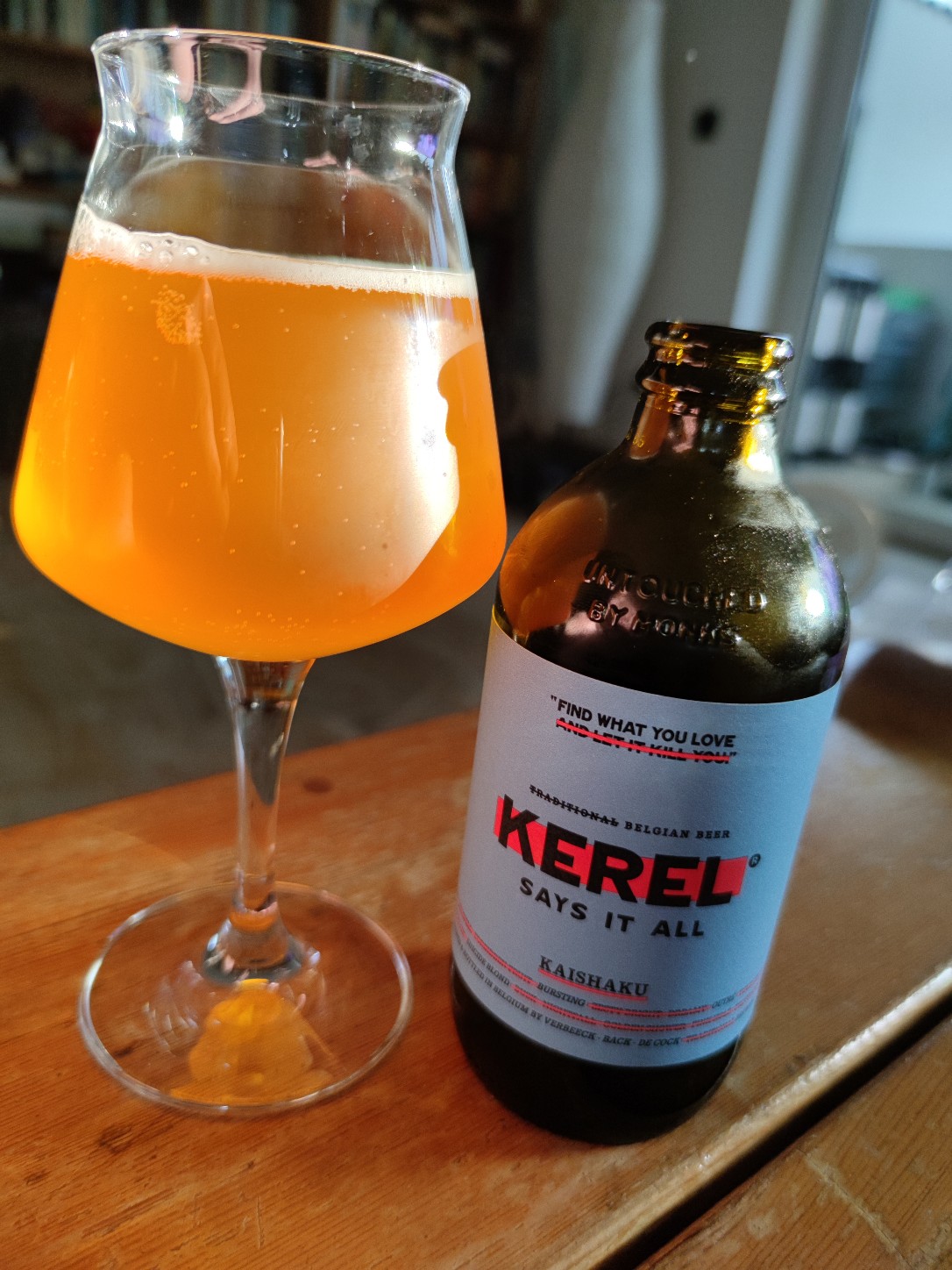 Kerel "Kaishaku", 13 IBU, 15% Alkohol. Es soll ein Golden Strong Ale sein. Es schmeckt maximal sprittig, keine Rezenz, kein Hopfen, der dagegen hält, kein Schaum. Schöne Farbe. Süß/Mastig ohne Ende. Ich frage mich, worauf die Brauerei hinaus will. Hipster-Etikett (Viel Text und alles, was sie nicht sind, durchgestrichen) reicht nicht. Die Brauerei sitzt in Antwerpen. Ich habe noch ein IPA und ein Saison. Hoffe, dass die nicht so schlecht sind, wie das Grapefruit IPA und dieses.