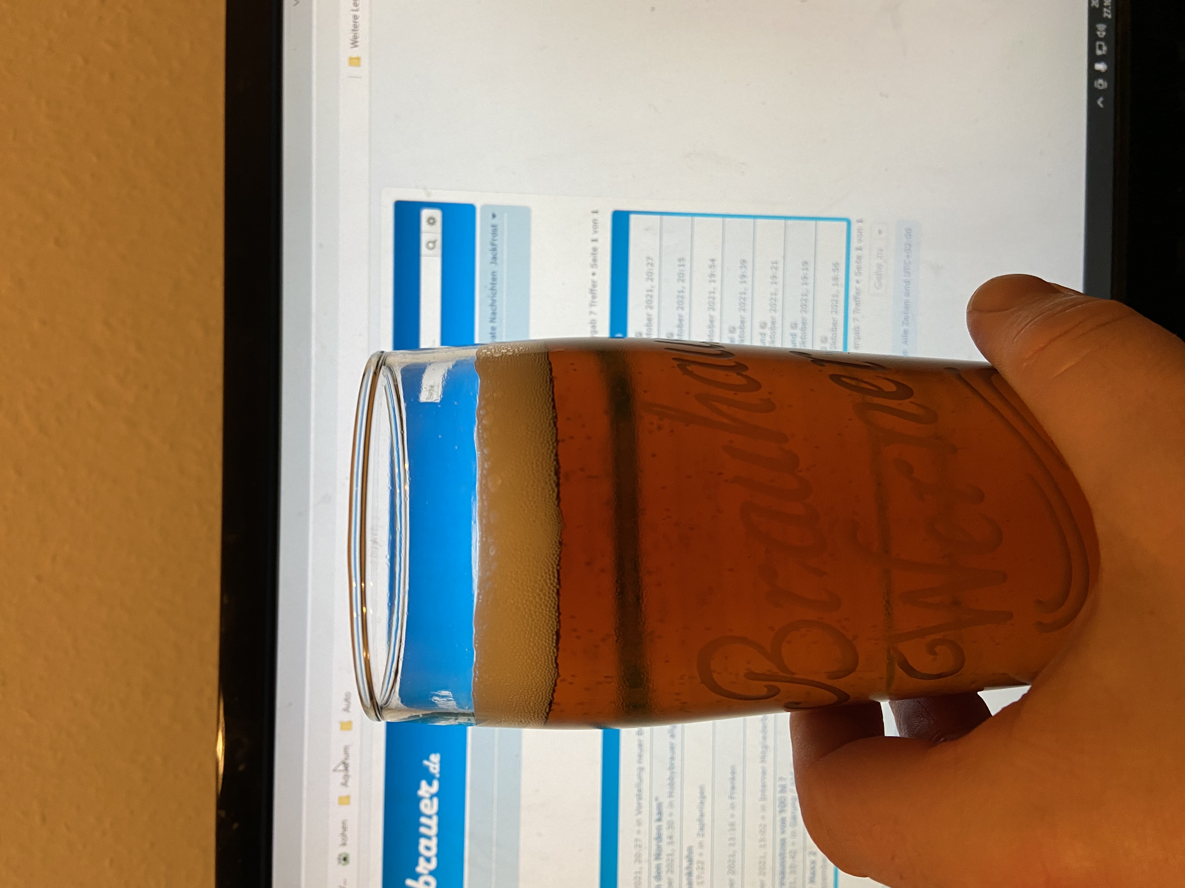 Und jetzt die erste Kostprobe meines Kürbisbiers. Is noch recht jung und etwas unrund, Gewürze sind subtil vorhanden und den Kürbis (4,5kg auf 10L) merkt man nur in der Bierfarbe. Mal sehen wie das in zwei Wochen schmeckt.