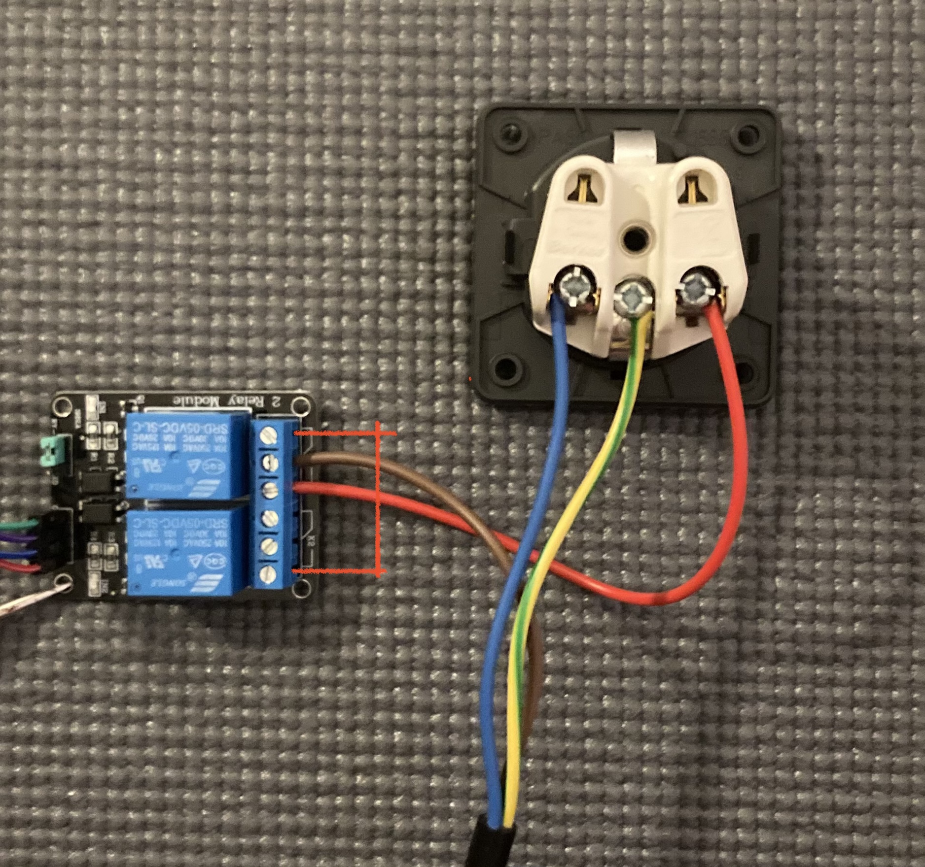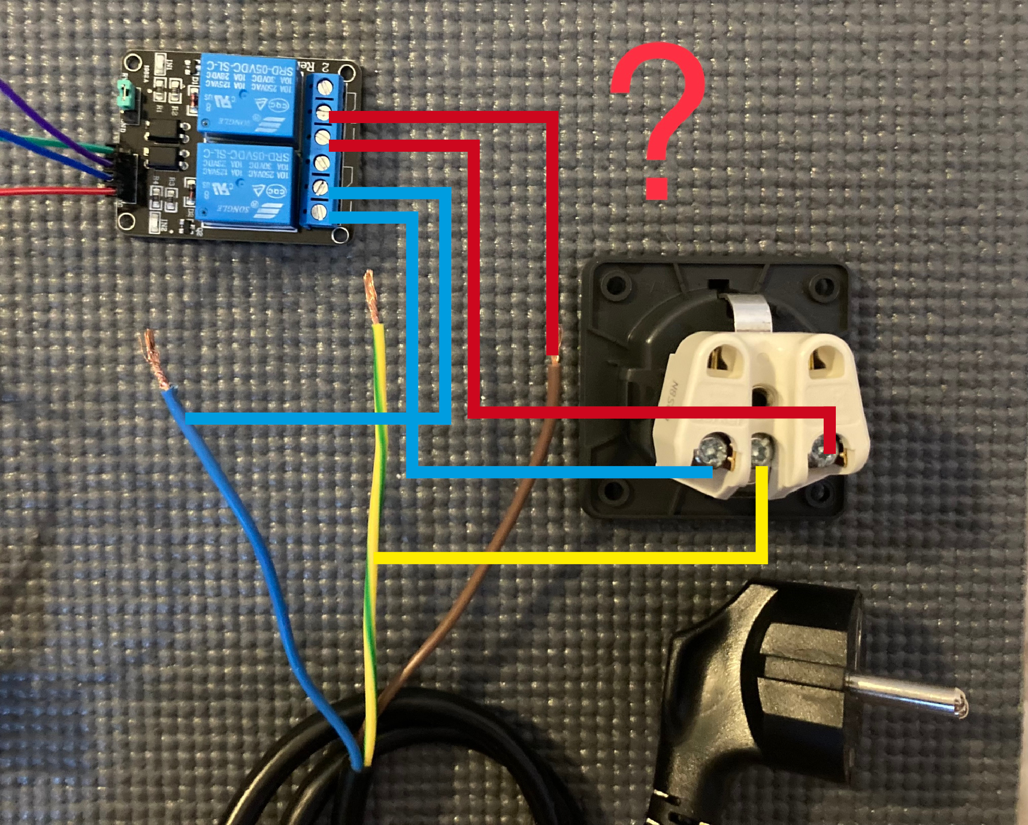 Damit es etwas sicherer wird, würde ich das 2. Relais zusammen mit dem 1. Relais schalten und den N (blau) analog zum L (rot) schalten. Dann liegt im ausgeschalteten Zustand keine Spannung an der Steckdose an.