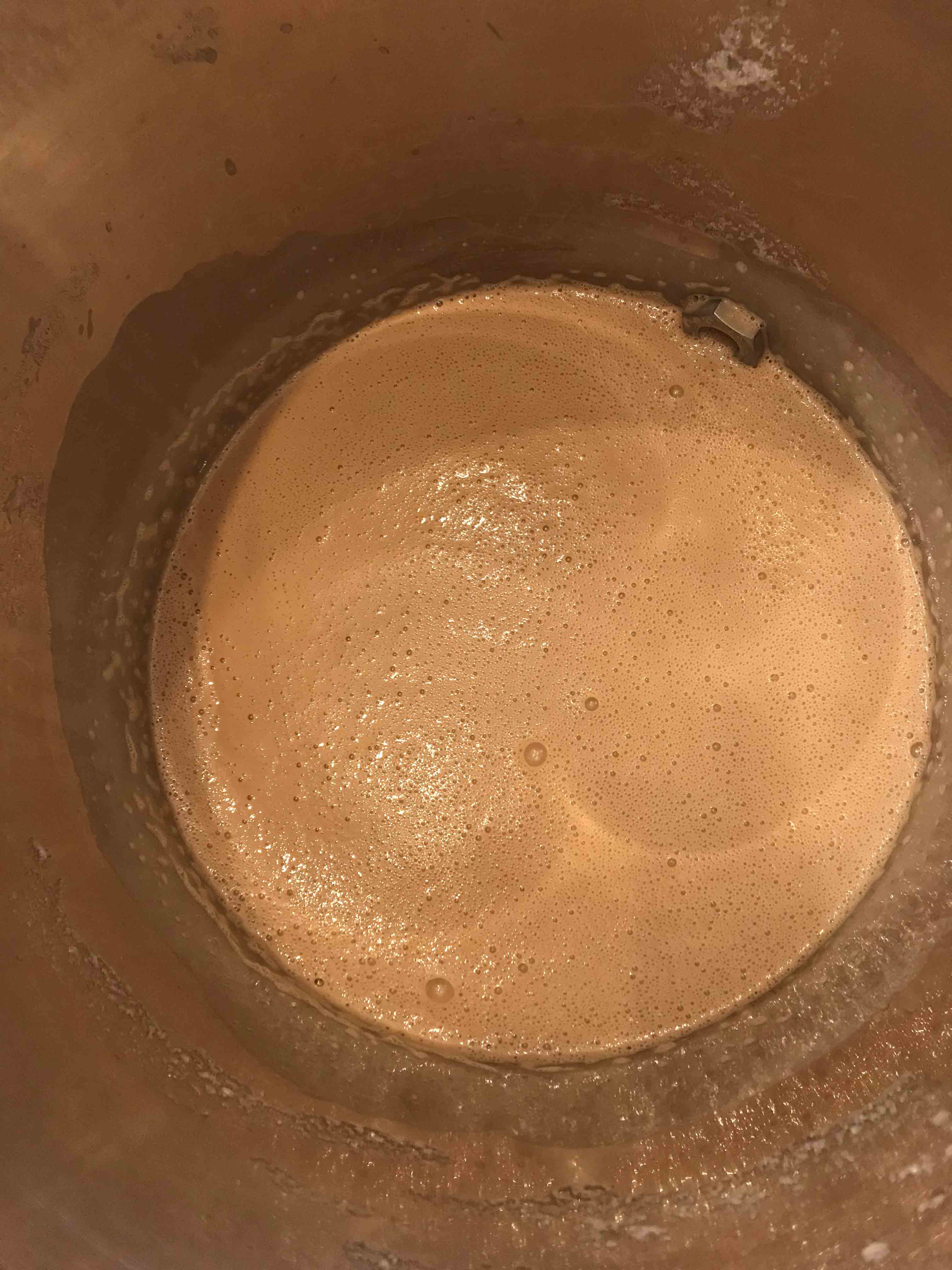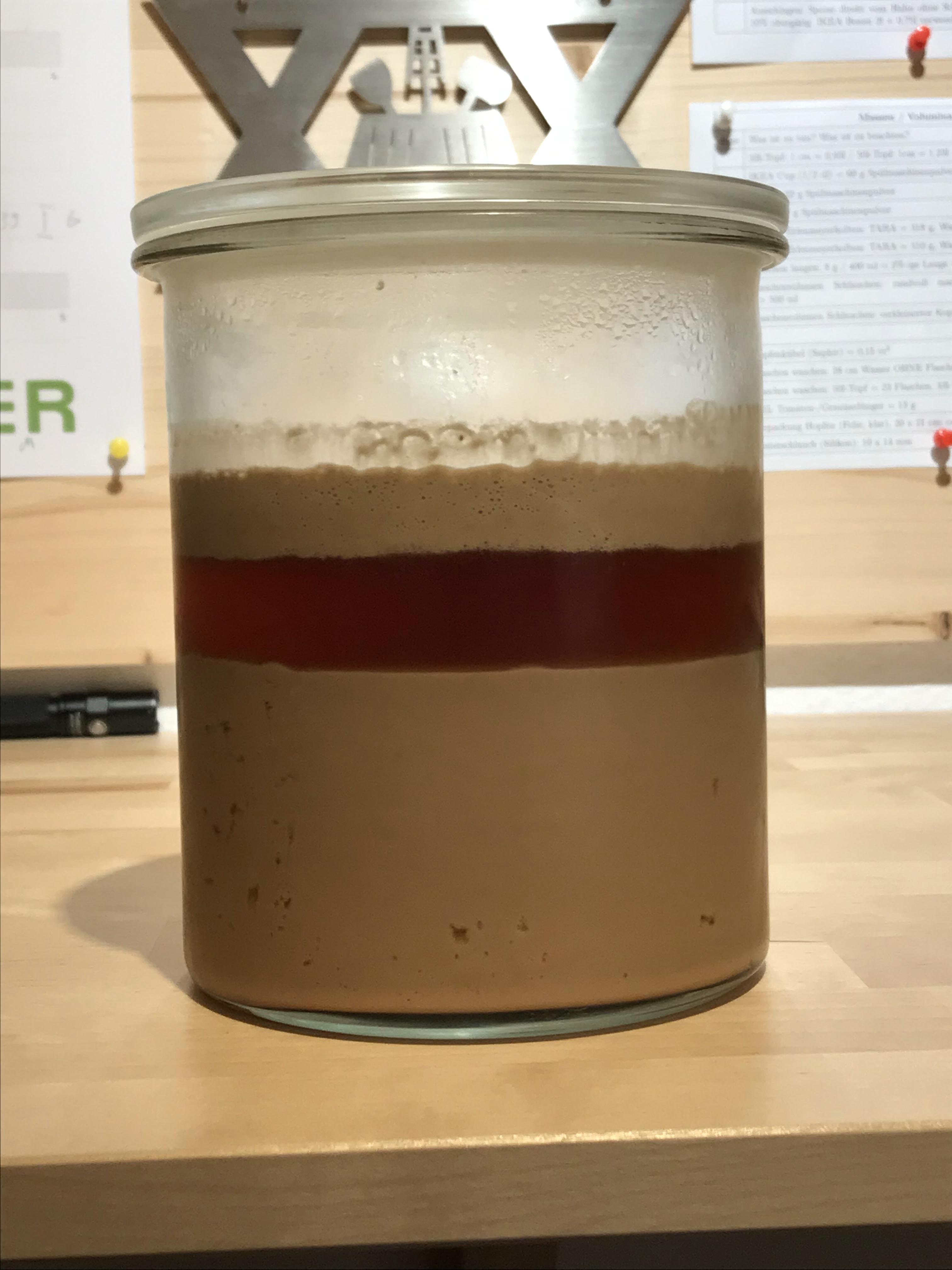 Nach dem Schlauchen bleibt im Gärtopf die sedimentierte Hefe mit Jungbier und Speise im Topf zurück: Das ganze wird dann von mir aufgeschwenkt: Und in ein 1.7 Liter IKEA Glas abgefüllt.