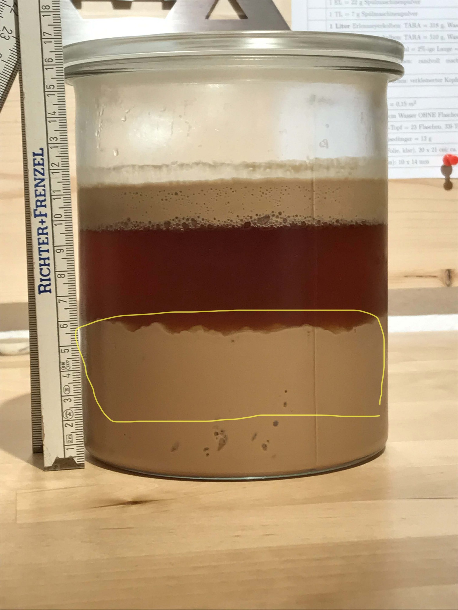 Der Überstand wird weggekippt, vom Bodensatz wird das notwendige Hefe Volumen
