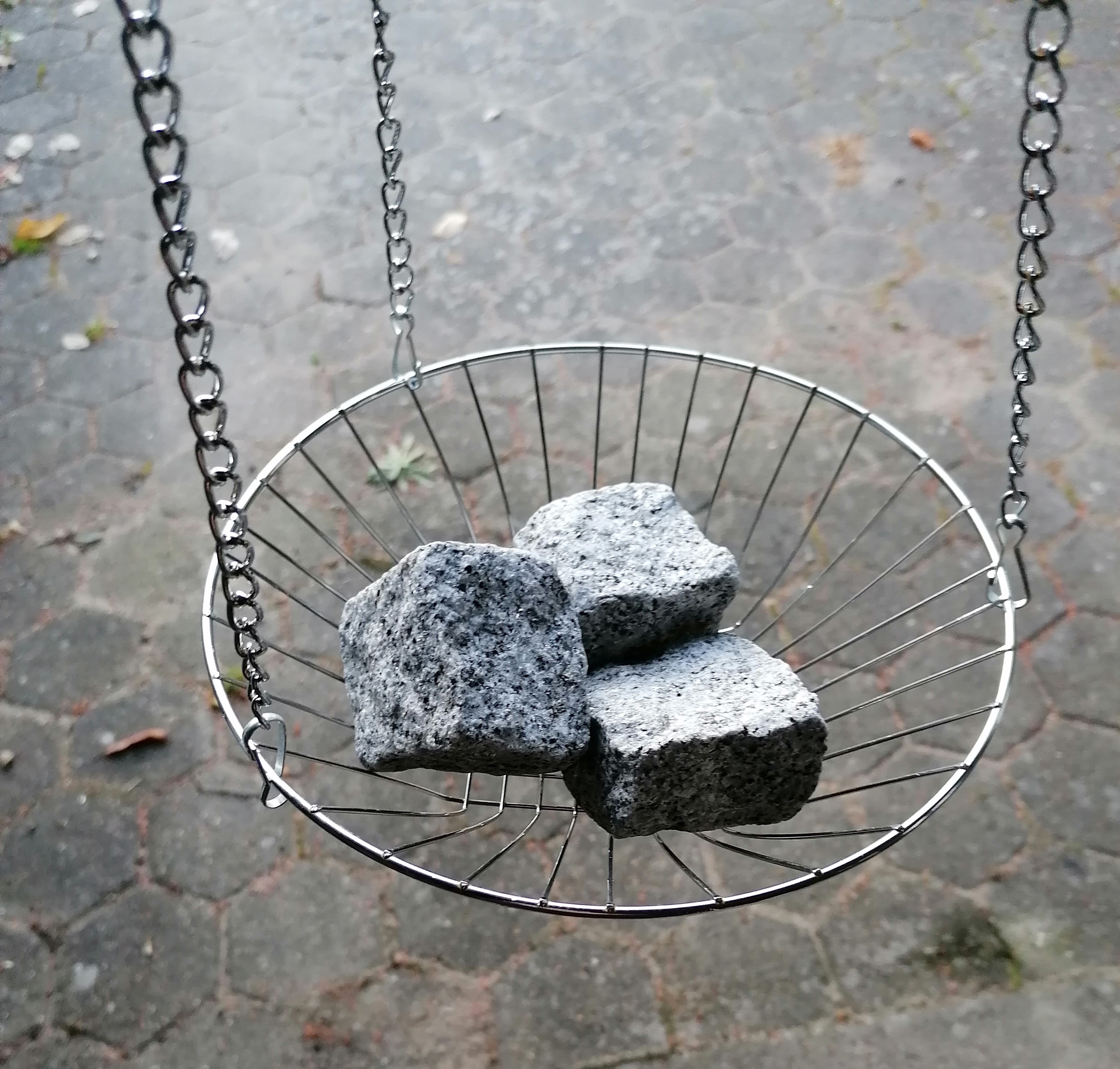 Es stellt sich mir weiterhin die Frage: Sind das die besten Steine? Granit hat wohl eine Wärmekapazität von 0,9 (kJ/KG)/k, bei Bimsstein wären es 1,05. Nur weiß ich nicht ob Bimsstein springt wenn man es so plötzlich abkühlt. Andererseits schwimmt er ja auf Wasser, also müsste man ihn irgendwie nach unten drücken in einem Korb...oder es gibt noch andere Eigenschaften, die dabei hinderlich sind... :Grübel