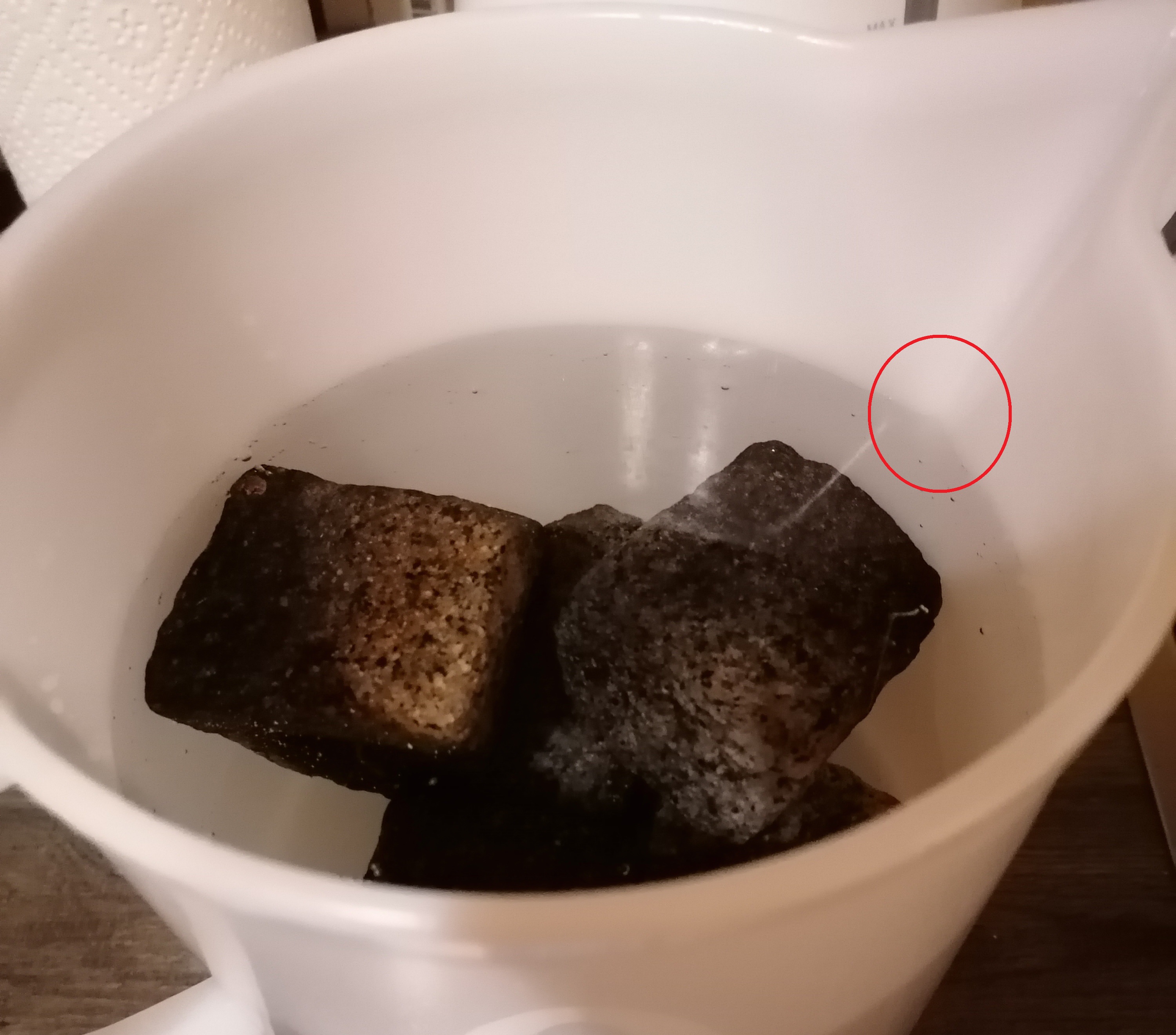 Was die erwähnten Brösel angeht, kann man ein paar im Wasser erkennen.
