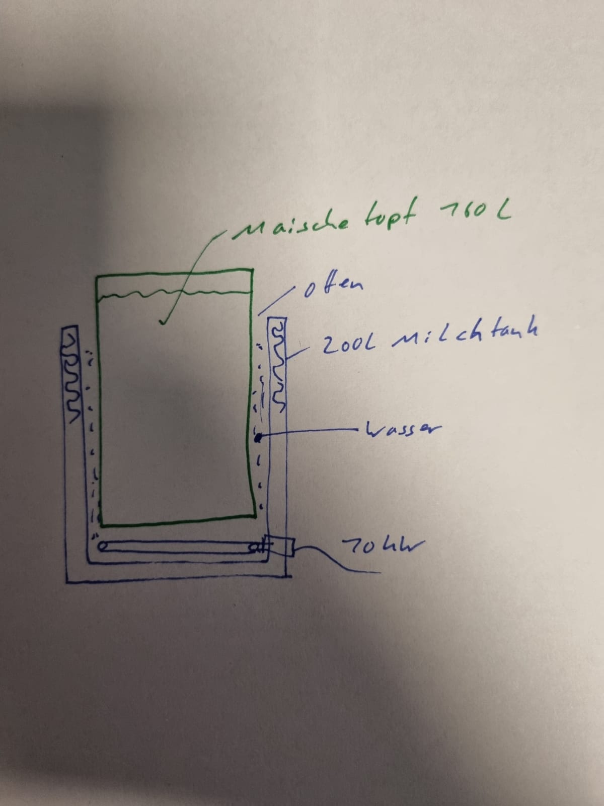 Gut, also wir wissen es sind 10 kW. Gib mal bitte den Durchmesser des Maischetopfs und den Durchmesser des äußeren Milchtanks an. Dann könnte man das überschlagsmäßig auf Thermodynamischem Ansatz durchrechnen. Ist der äußere Topf doppelwandig? Sieht in der Zeichnung so aus.