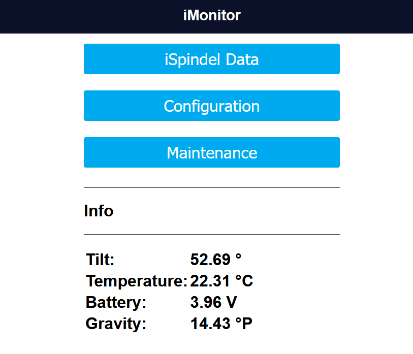 Auf der Hauptseite sind die aktuellen iSpindel-Werte sichtbar, ähnlich wie im iSpindel Menü: