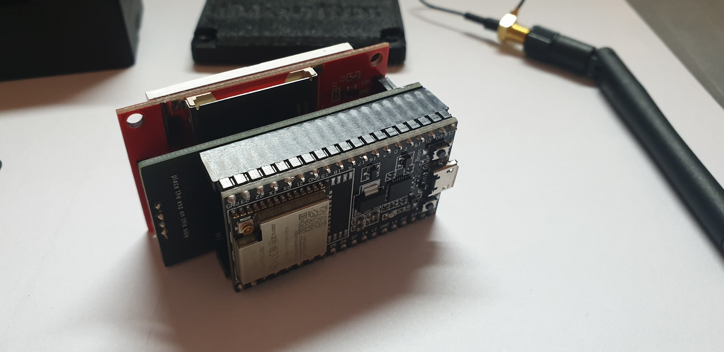 Betrieben wird alles über einen ESP32, der auf eine eigene Platine gesteckt wird. auf der gegenüberliegenden Seite ist ein 1.8" TFT-Display verbaut und dazwischen die Antenne mit Kabel zum ESP.