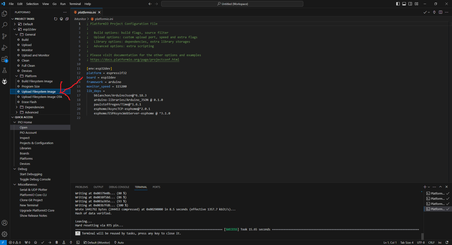 Nach dem öffnen des Projektes in PlatformIo müsst ihr einmal auf "Build" und danach auf "Upload" klicken um den Hauptcode hochzuladen. Da noch einige Javascript- und html-Dateien im Projekt sind muss man noch auf "Build Filesystem Image" (den iMonitor nicht mit dem PC verbinden bei diesem Schritt), danach mit verbundenem iMonitor auf "Upload Filesystem Image" klicken.