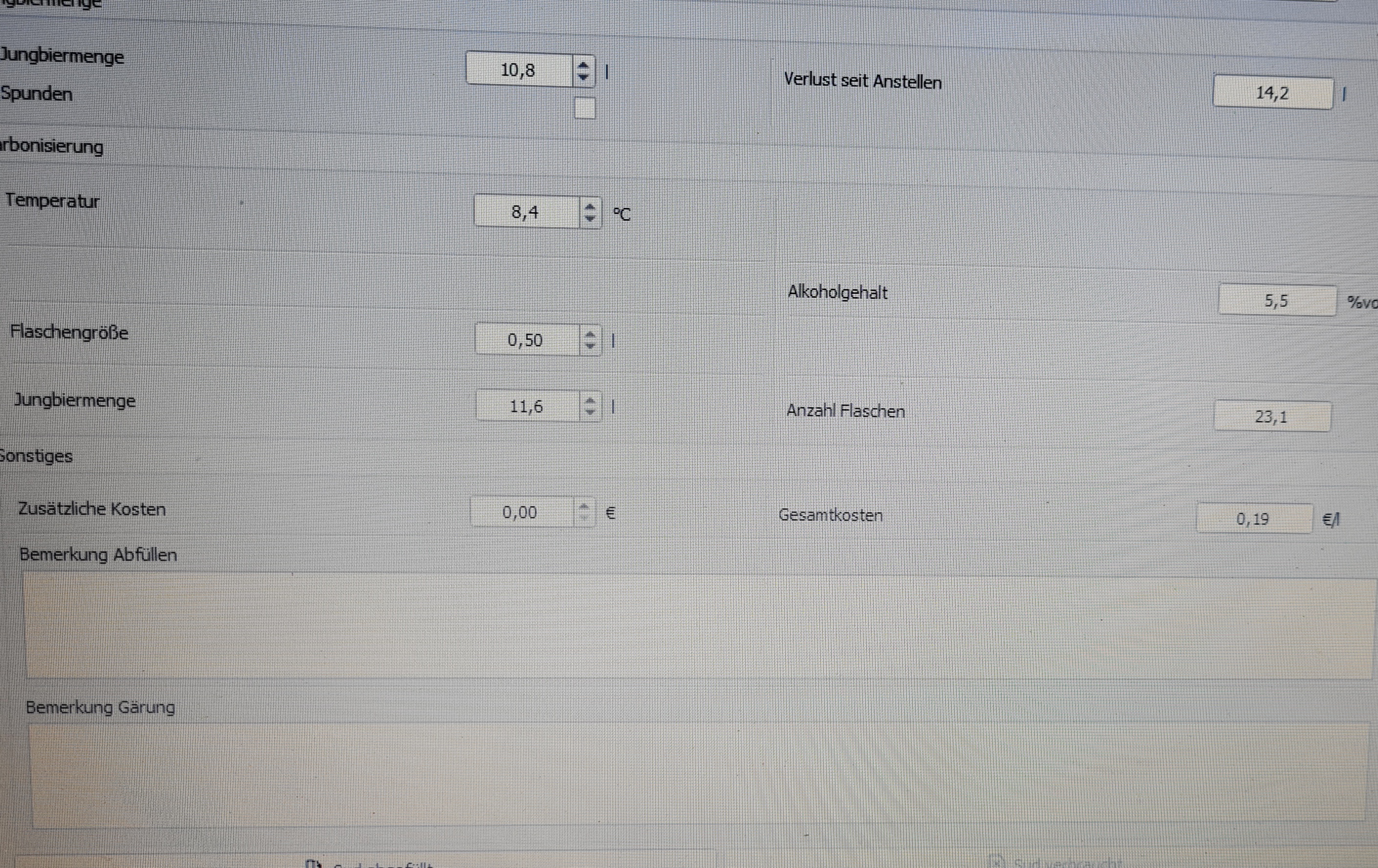 Nun wird mir aber beim Abfüllen für die Flaschengärung der "Zusätzlich benötigter Zucker" bei Jungbiermenge = 18l garnicht angezeigt und bei 20l nur 0,2g / 0,33l Flasche anzeigt. Der Wert müsste eher bei ~6,6g/Liter liegen. Ich meine der Wert war auch mal richtig, aber nachdem ich das Rezept kopiert habe und parallel verändert, kam es zu den viel zu kleinen Werten. Habt ihr eine Idee, was hier schiefgelaufen ist?